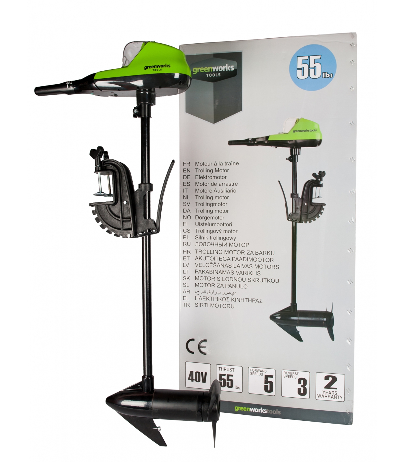Лодочный мотор Greenworks Арт. 9000207 - уникальная модель электрического лодочного мотора, которая работает от аккумулятора 40 В, совместимого с более чем 50 устройствами серии G-MAX 40V.