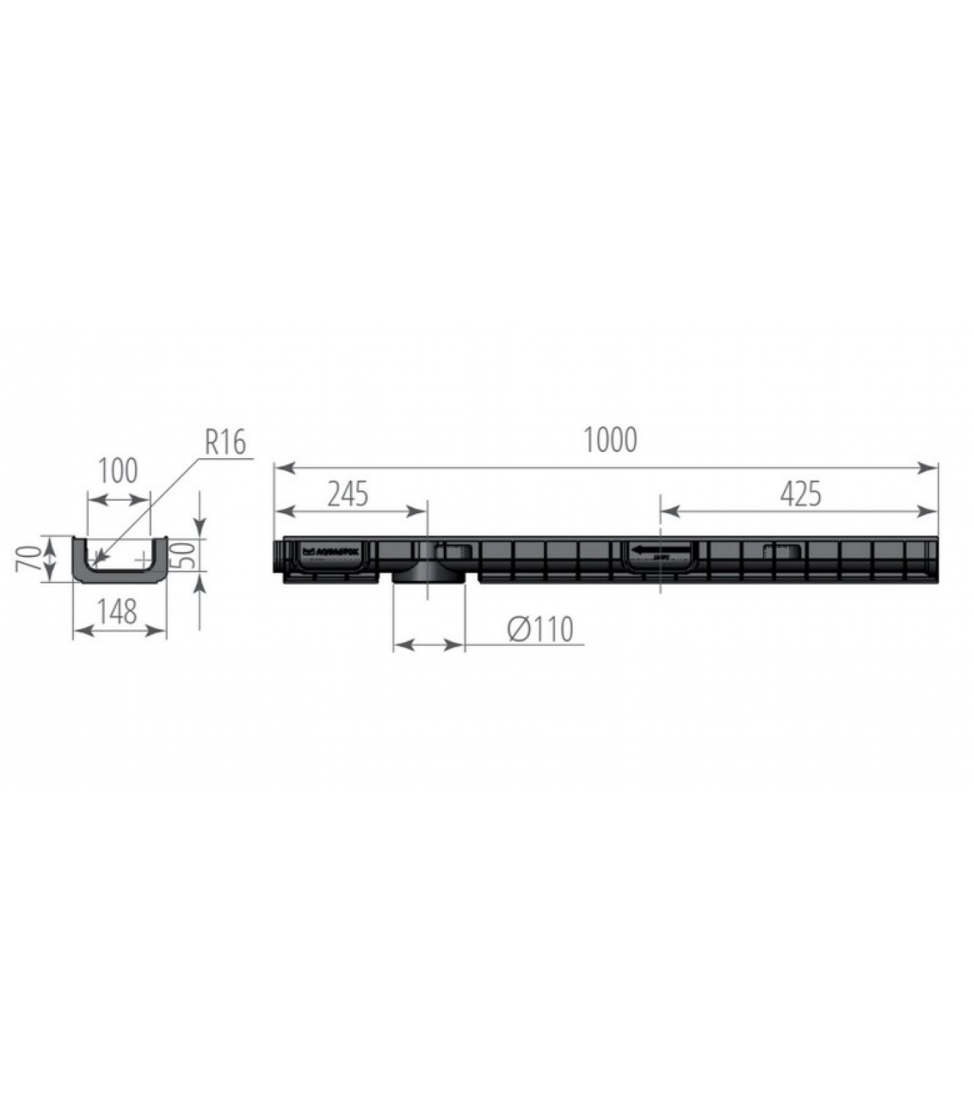 Лоток водоотводный пластиковый Aquastok ЛВП Norma DN100, 1000*148*70, класс нагрузки C250