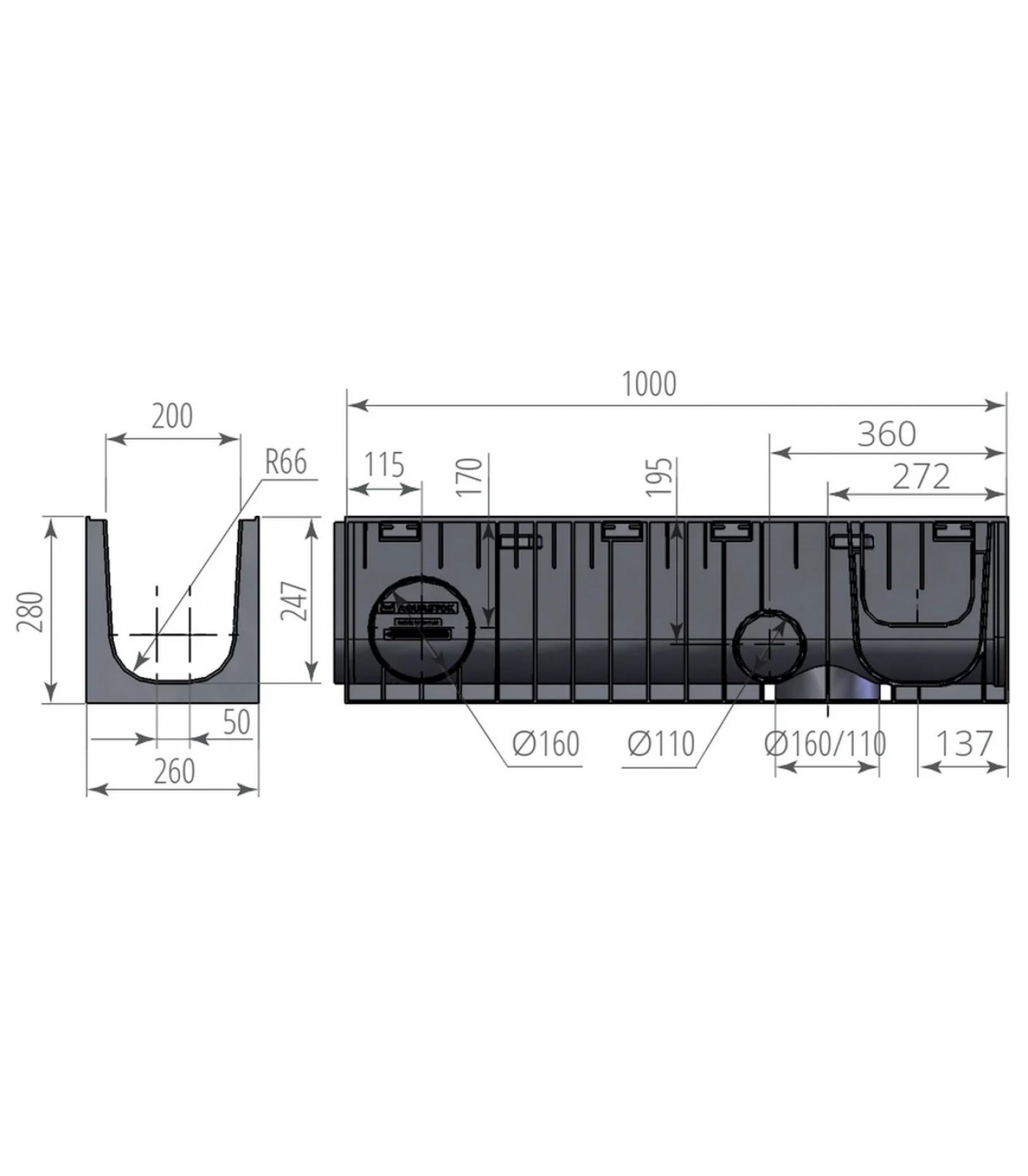 Лоток водоотводный пластиковый Aquastok ЛВП Norma DN200, 1000*260*280, класс нагрузки C250
