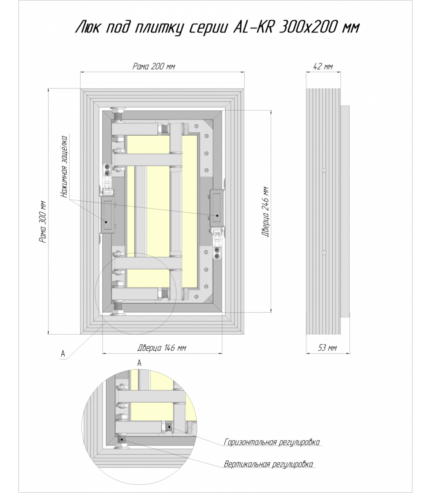 По конструкции петли люк аналогичный серии ALR, что говорит о регулировки петли вверх, вниз, влево и вправо. Преимущество над серией люков ALR, в том, что изменена конструкция внешнего вида профиля, «он увеличен и при этом состав алюминиевого проката не изменился» что позволило производить алюминиевые люки больших размеров с принципом открывания, легкого нажатия на дверцу люка, так же люк оснащен резиновым уплотнителем по периметру дверцы, что придает люку герметичность.