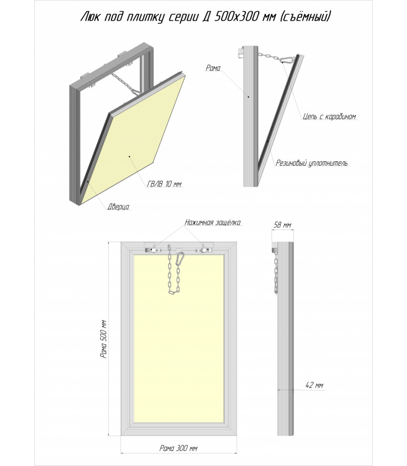 Люк серии Д (доступ) - люк под плитку со съемной дверцей предназначен для установки в места с ограниченным доступом, где люк с петлевым механизмом невозможно установить. Люк открывается легким нажатием на дверцу и оснащен страховочной цепочкой и карабином. Люк изготовлен из алюминиевого проката, дверца облицована влагостойким ГВЛВ, по периметру дверцы имеется резиновое уплотнение. Данная модель люка может быть монтирована в стены из кирпича, бетона, пенобетона, гипсокартона и т.д. Особенности данной модели: бюджетный вариант, простота установки, легкий, может быть облицован различными отделочными материалами.