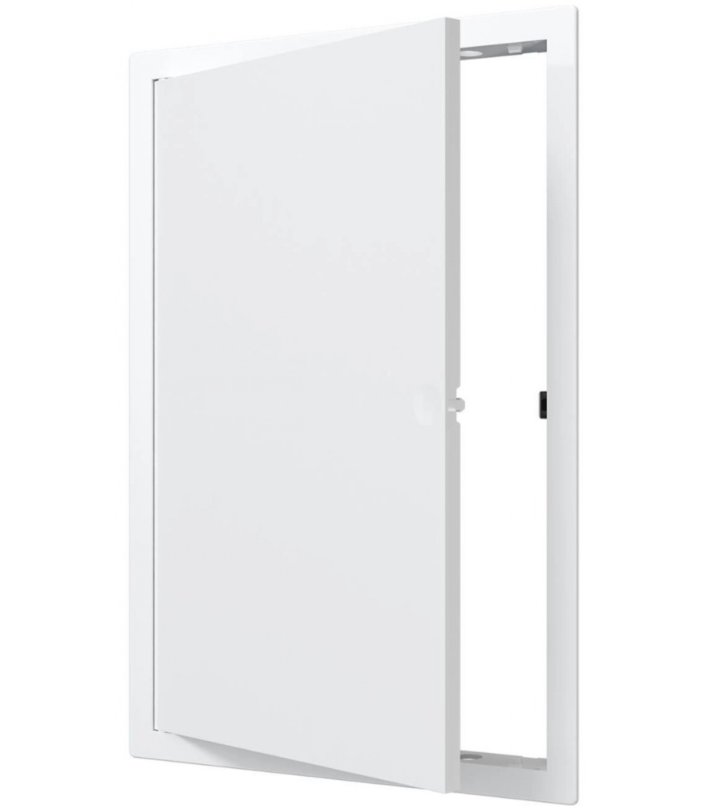 Нажимной замок фиксирует дверцу, не позволяя ей самопроизвольно открываться, за счет чего люк устанавливается не только в стену, но и в потолок.