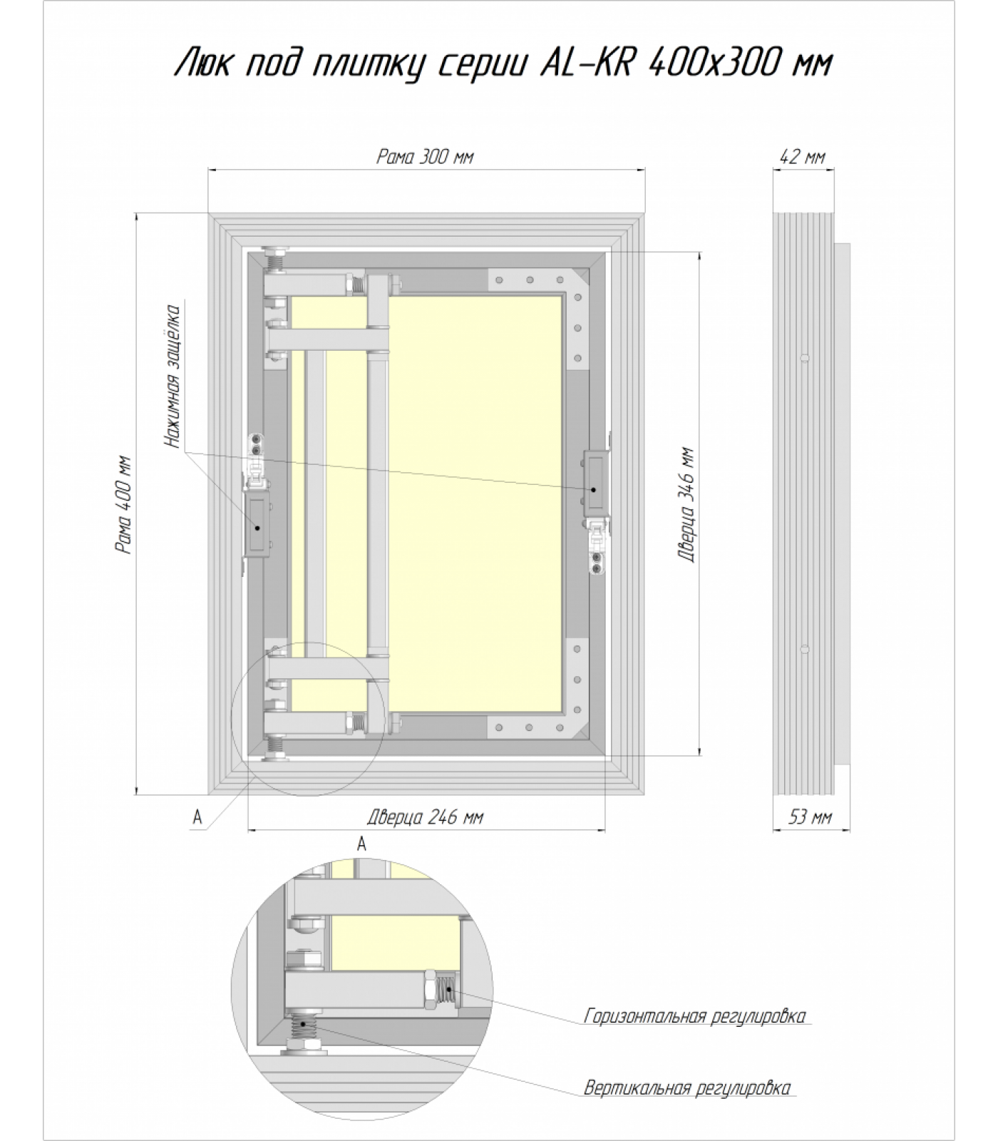 По конструкции петли люк аналогичный серии ALR, что говорит о регулировки петли вверх, вниз, влево и вправо. Преимущество над серией люков ALR, в том, что изменена конструкция внешнего вида профиля, «он увеличен и при этом состав алюминиевого проката не изменился» что позволило производить алюминиевые люки больших размеров с принципом открывания, легкого нажатия на дверцу люка, так же люк оснащен резиновым уплотнителем по периметру дверцы, что придает люку герметичность.