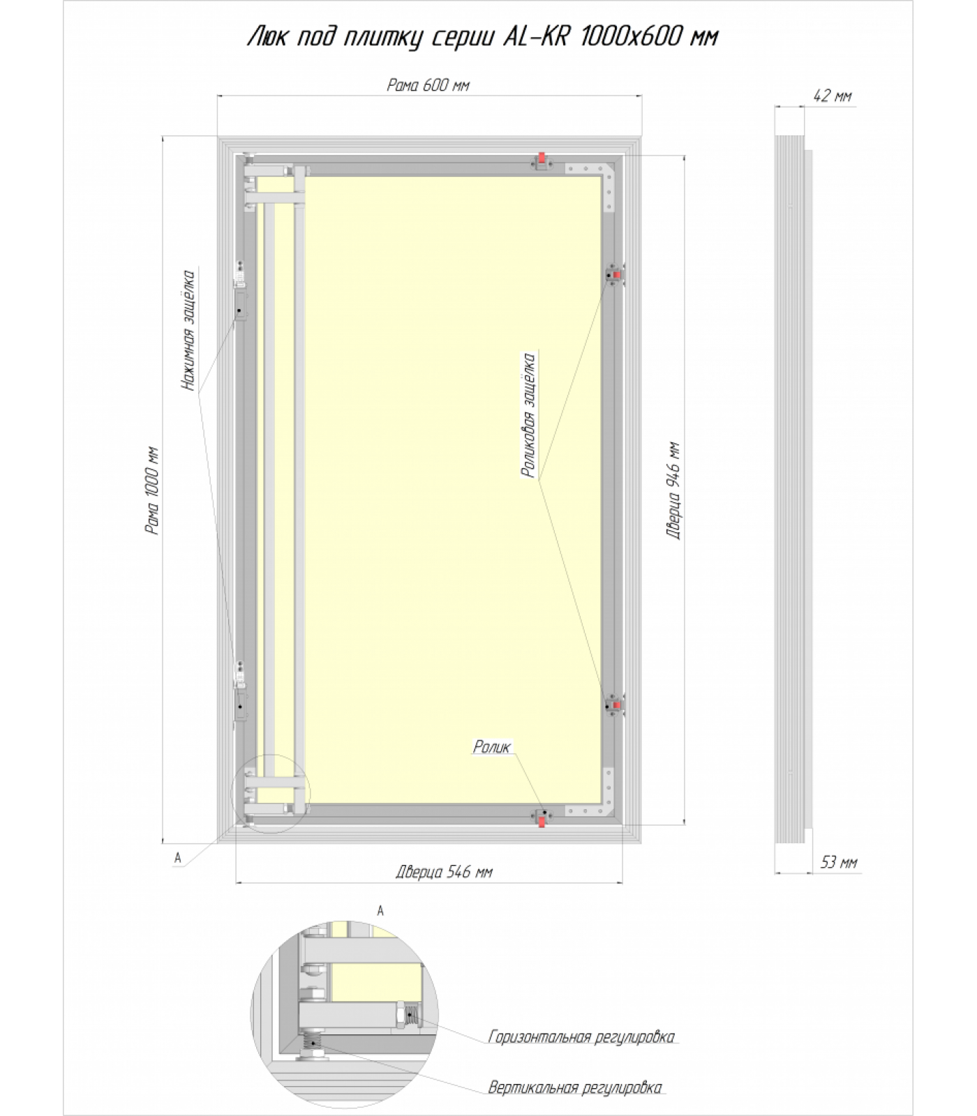 Этот люк невидимка отличается особенностями конструкциями, позволяющими регулировать стальную петлю по вертикали и горизонтали, что придаёт ему высокую грузоподъёмность, а также гарантирует длительный срок эксплуатации. Встроенный люк отличается такими немаловажными качествами как высокая прочность, долговечность и практичность. Увеличенный профиль данного люка позволяет производить алюминиевые люки больших размеров с принципом открывания, легкого нажатия на дверцу люка, так же люк оснащен резиновым уплотнителем по периметру дверцы, что придает люку герметичность. Люк серии AL-KR может быть облицован любым отделочным материалом, так как рассчитан на высокие нагрузки.