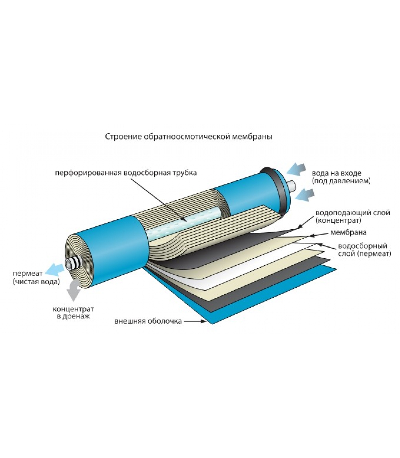 Обратный осмос является натуральным процессом, суть которого заключается в отделении мембраной молекул воды от растворенных в ней субстанций. Благодаря такой очистке из воды удаляются органические и неорганические соединения, а также тяжелые металлы, бактерии и вирусы.