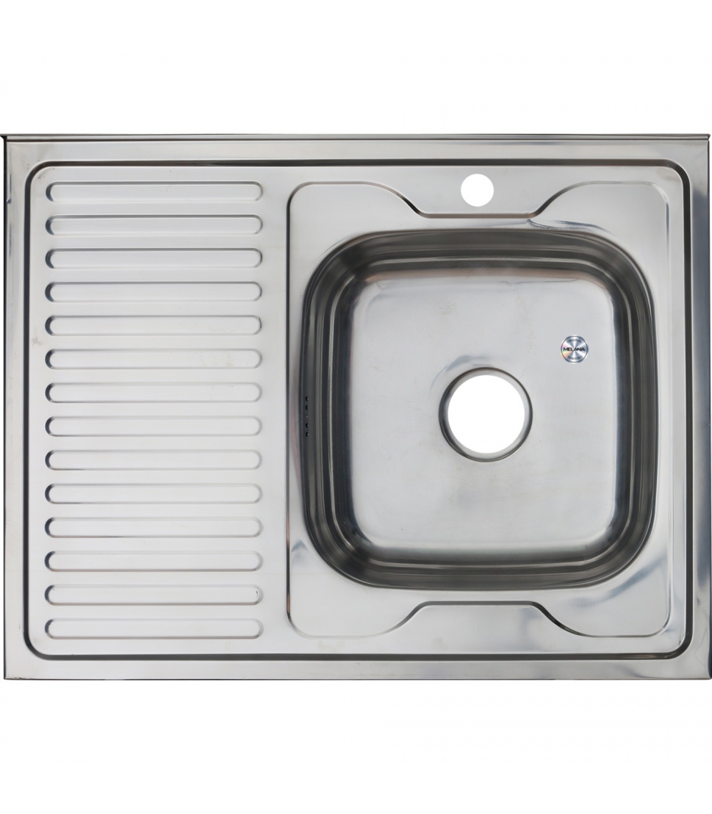 Большая накладная мойка 80х60 очень удобна в использовании. Широкое крыло позволяет организовать дополнительную рабочую поверхность, на которой можно сушить вымытую посуду и овощи, размораживать продукты, ставить горячие сковороды и кастрюли.