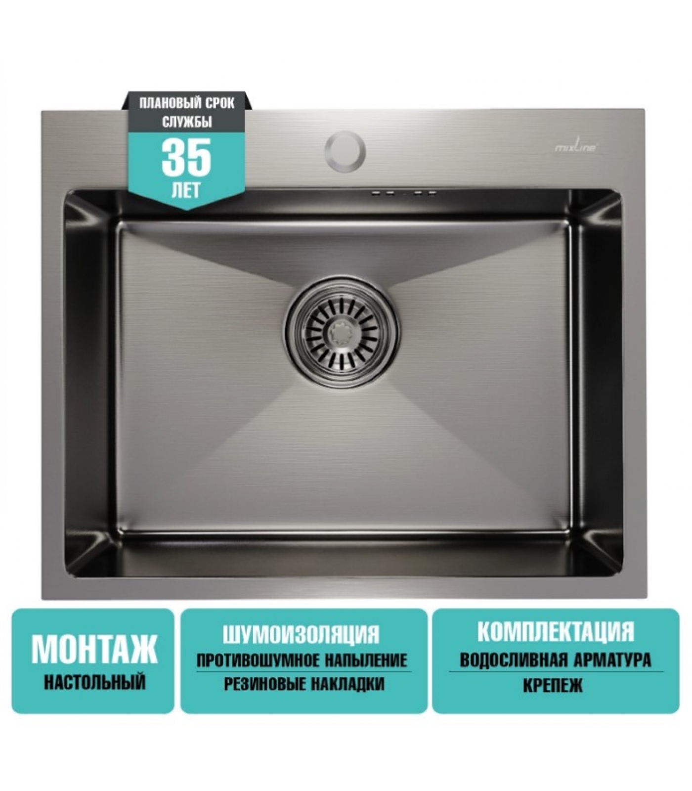 Мойка для кухни MIXLINE PRO 53х43х22 (3,0) настольный монтаж, вып 3 1/2, сифон, сатин