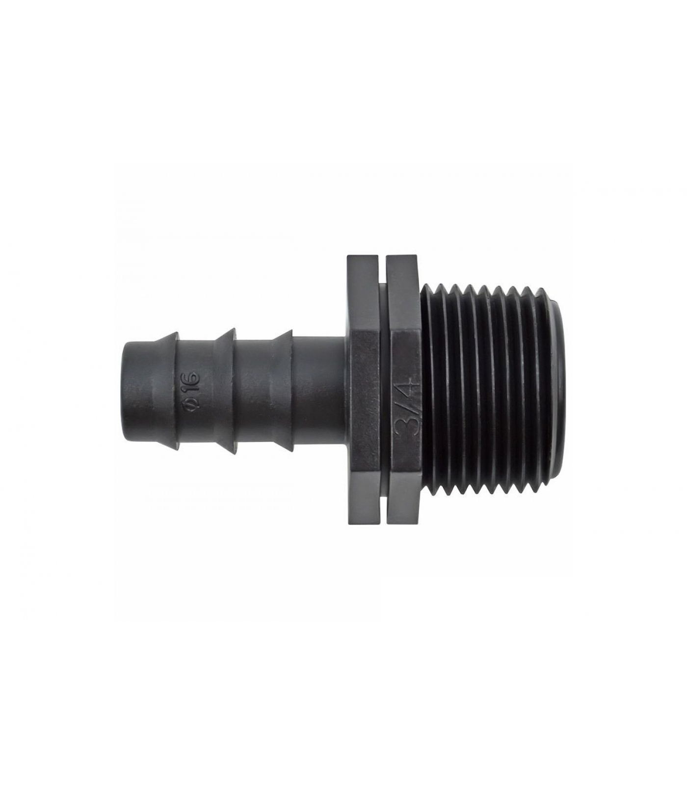 Штуцер с соединением "елочка" в трубку диаметром 16 мм с переходом на наружную резьбу 3/4". Соединяет капельную трубку 16 мм. с краном к основному магистральному трубопроводу или другим трубкам с помощью резьбовых соединений.