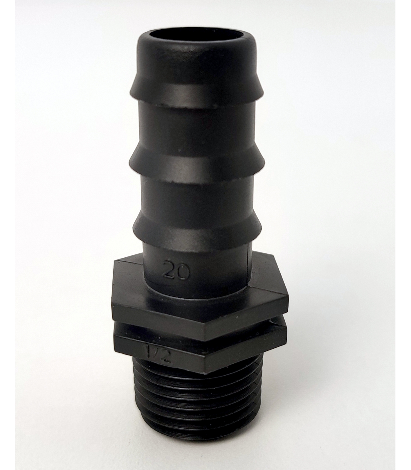 Штуцер с соединением "елочка" в трубку диаметром 20 мм с переходом на наружную резьбу 1/2". Соединяет капельную трубку 20 мм. с краном к основному магистральному трубопроводу или другим трубкам с помощью резьбовых соединений.