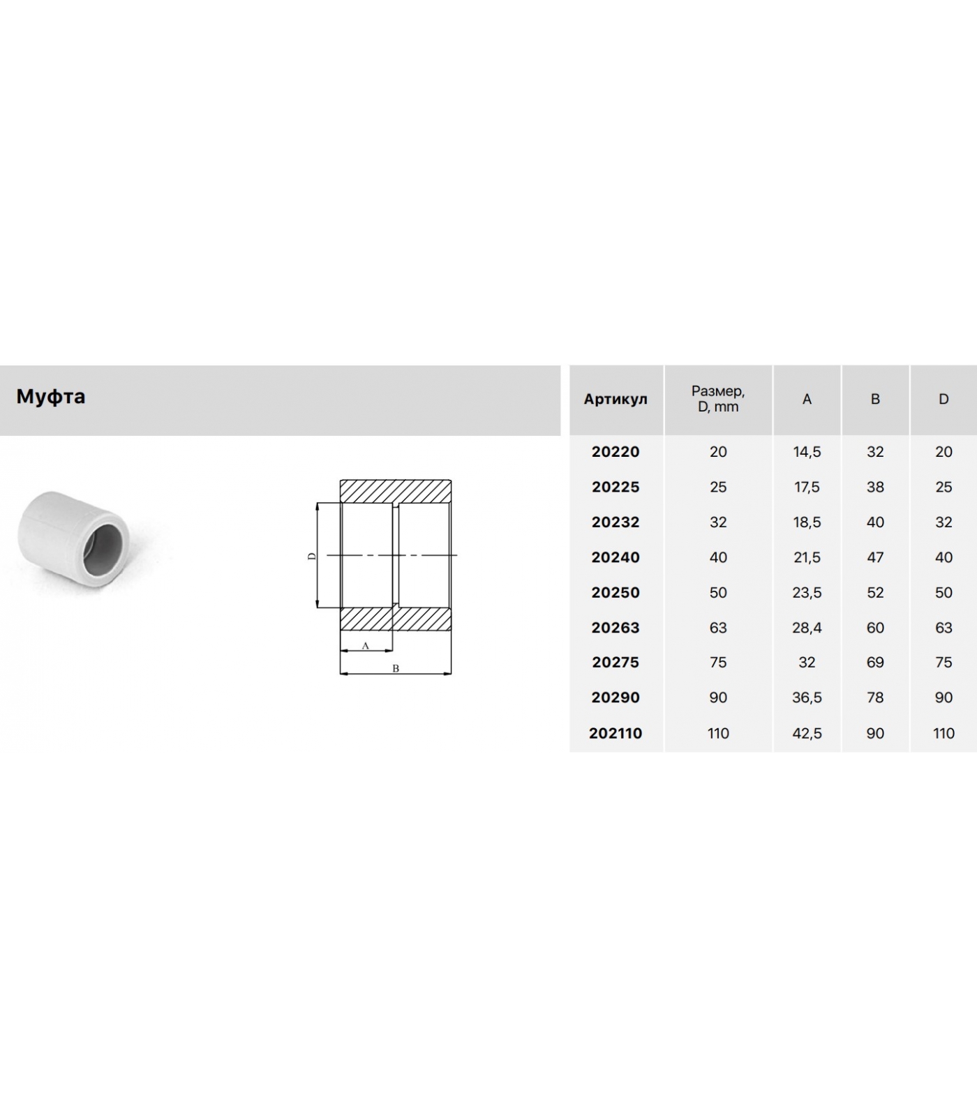 Муфта равнопроходная предназначена для монтажа полипропиленовых трубопроводов одинакового диаметра.