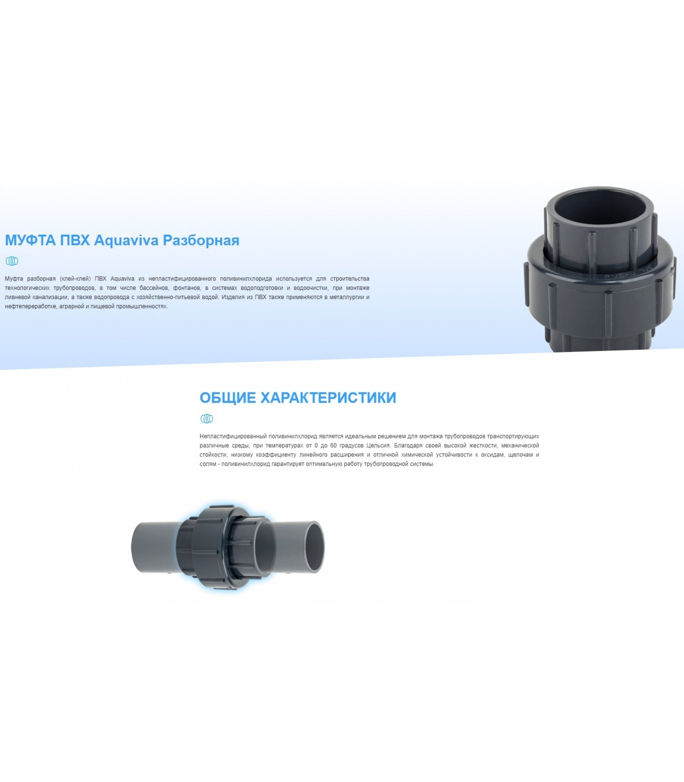 Муфта разборная c уплотнением EPDM используется для клеевого соединения концевых отверстий элементов водопровода с одинаковым диаметром.
