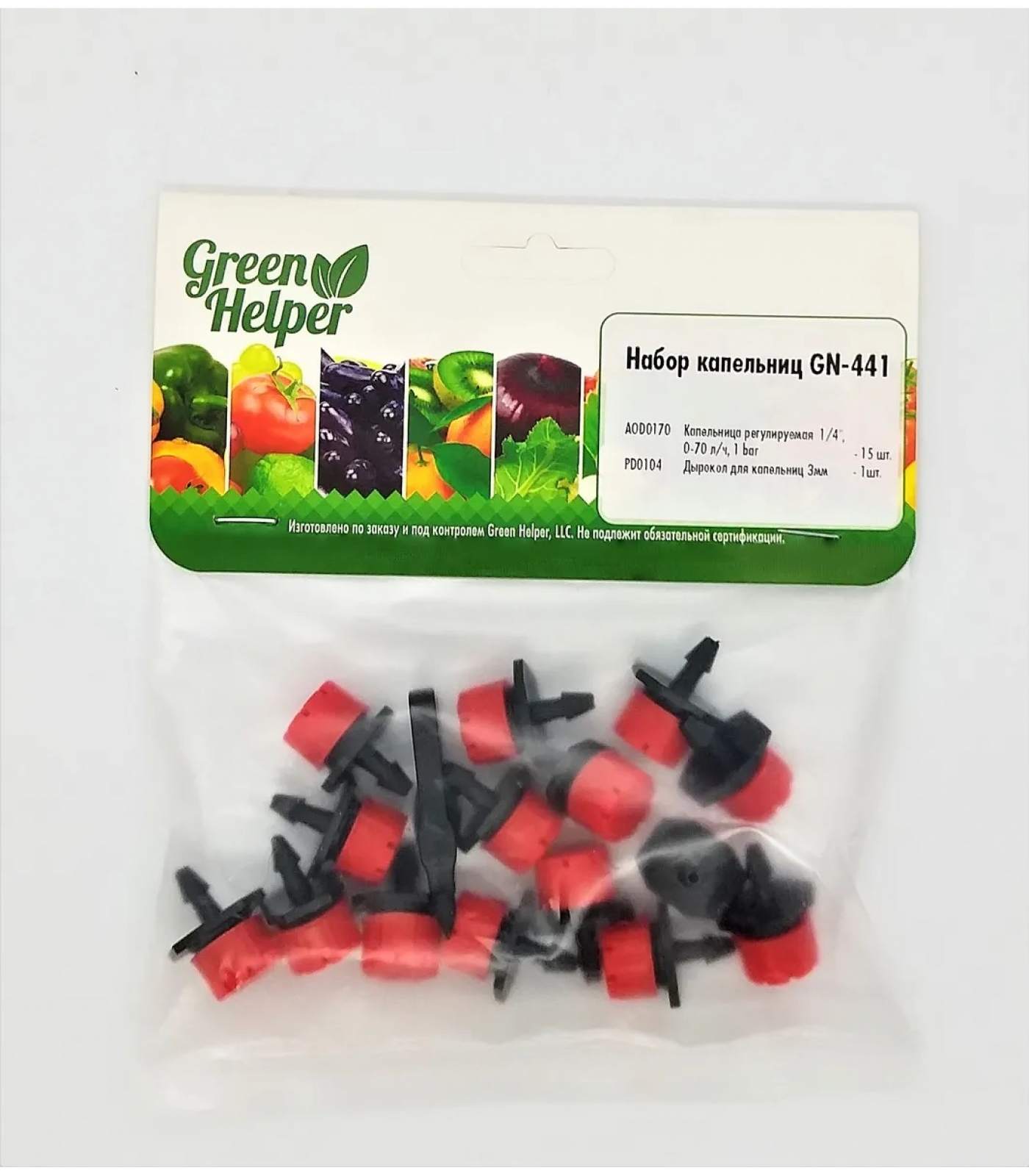 Набор для полива Green Helper GN-441 включает в себя 15 регулируемых капельниц (разбрызгивателей). Они крепятся к шлангу или трубке при помощи дырокола и соединительного шипа. Расход воды одной капельницы: 0-70 л/ч. Диаметр разбрызгивания одной капельницы: 5-150 см.