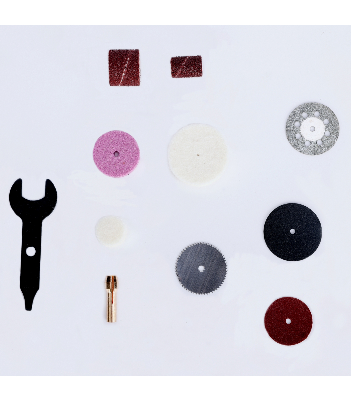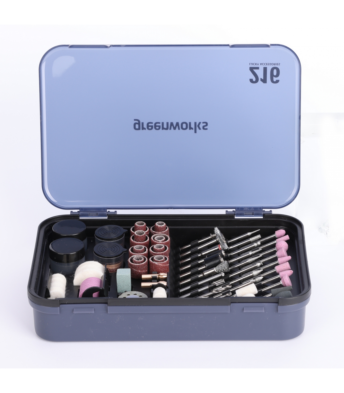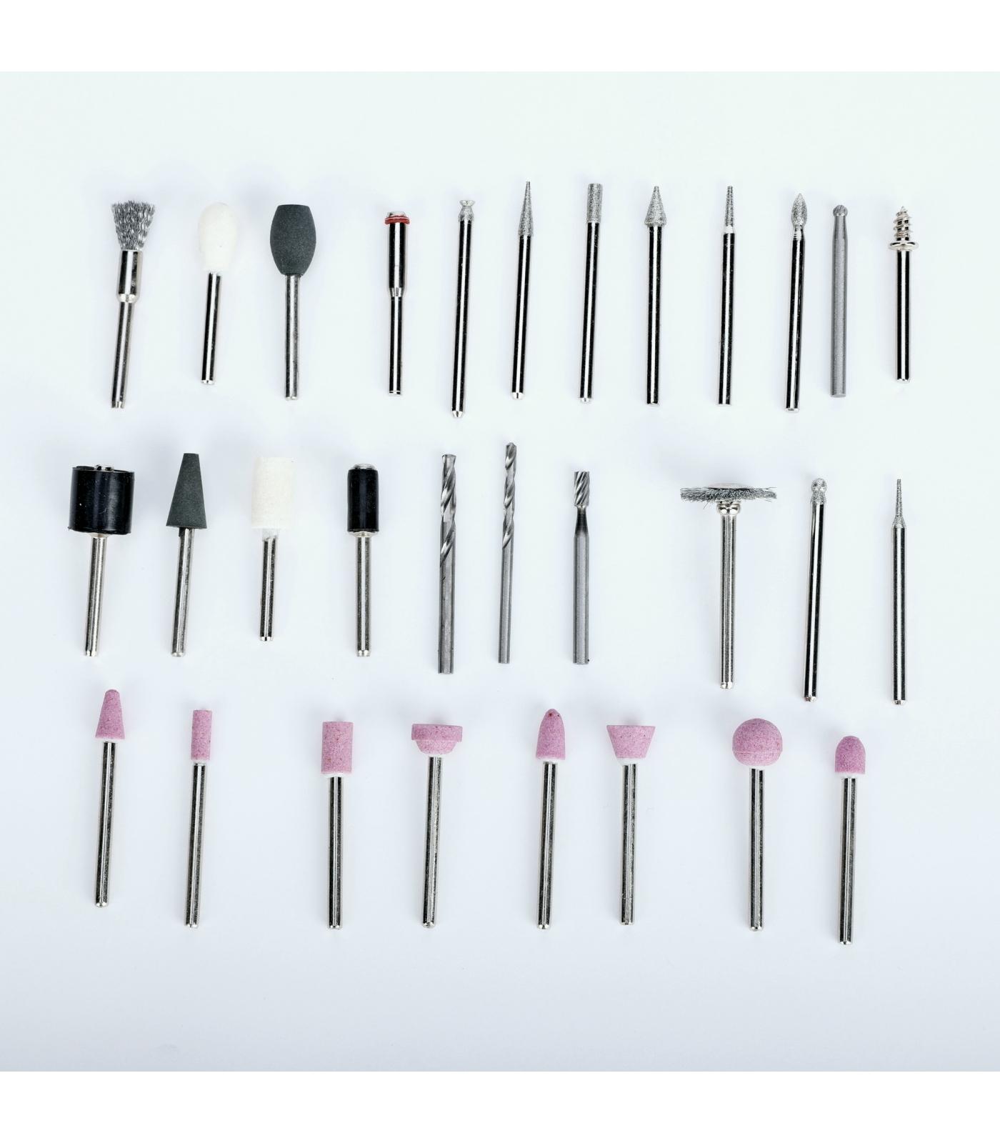 В набор входят 216 предметов оснастки для выполнения различных операций, например гравировки, сверления, шлифовки, полировки и резки.
