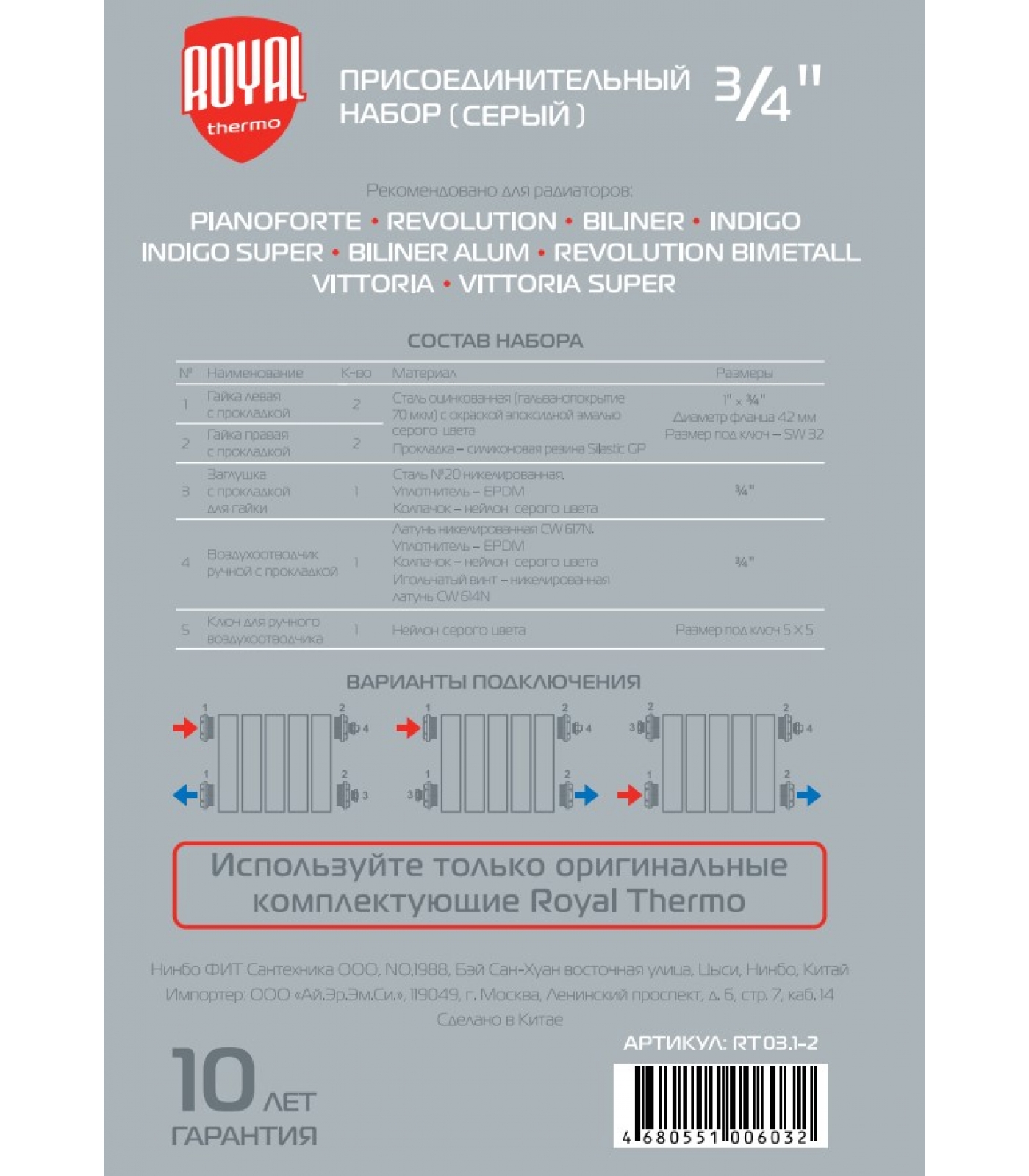 Набор радиаторный универсальный 3/4" Royal Thermo 7 элементов, серебристый