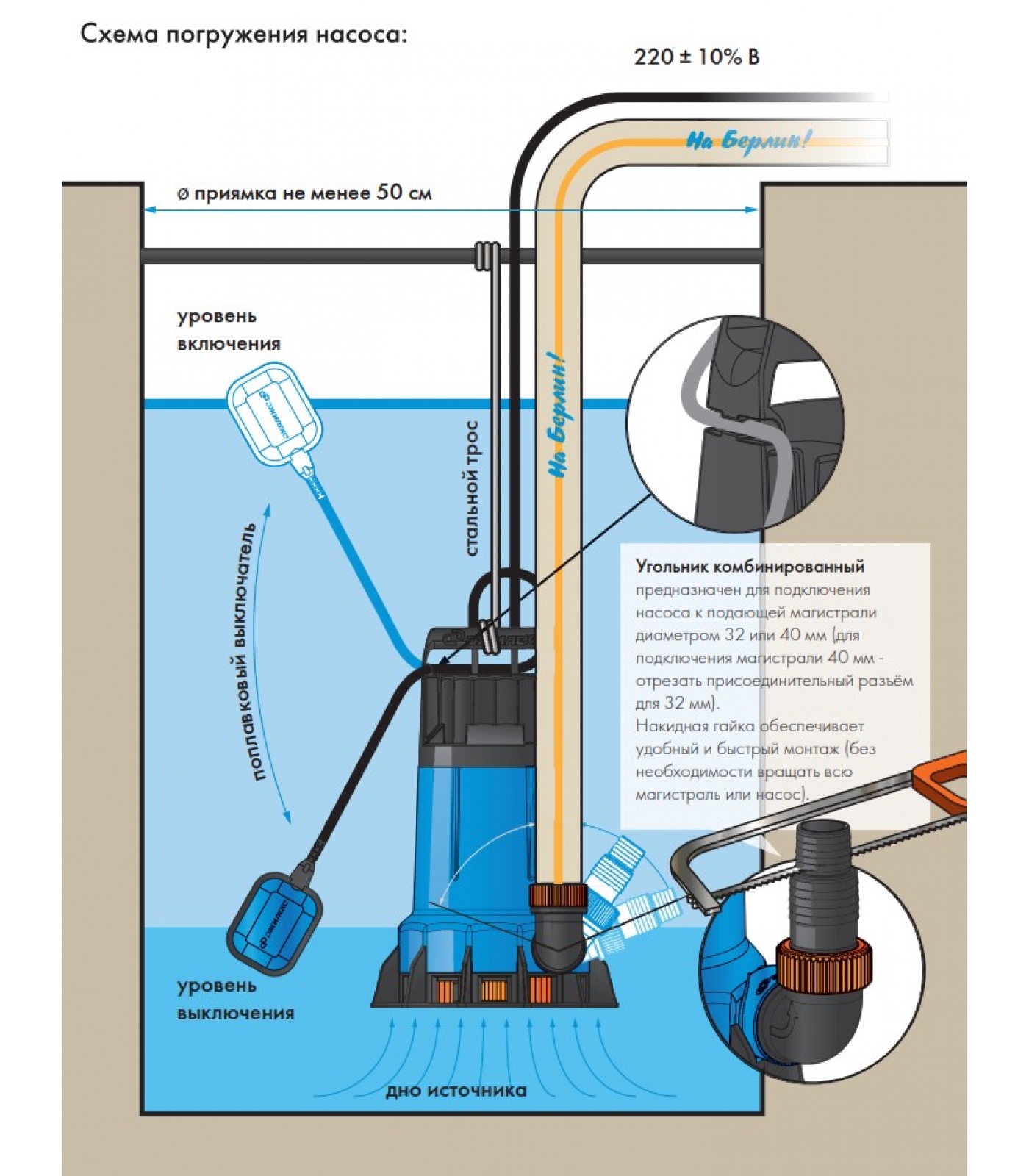 Оснащен поплавковым выключателем для автоматизации насоса.