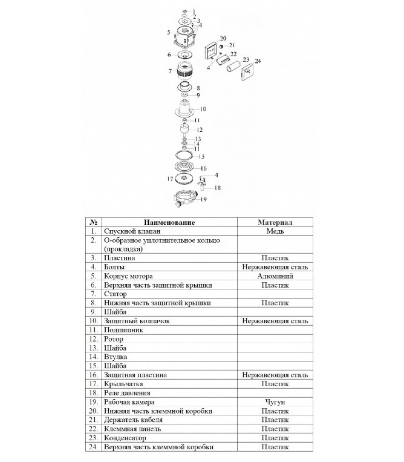 Корпус мотора из алюминия, корпус рабочей камеры из чугуна, крыльчатка из пластика, присоединение фланцевое