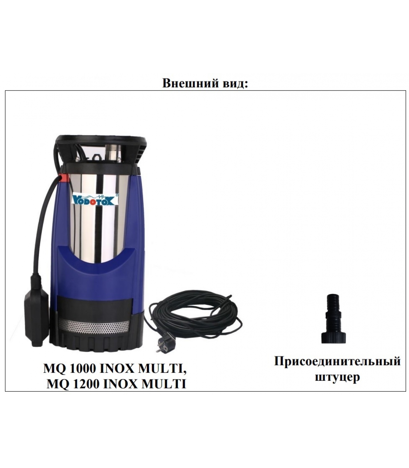 Насос для колодцев "Vodotok" MQ 1200 INOX MULTI (с поплавком), (1,2кВт, max 6.3м3/ч, Н-44м, d 25мм)