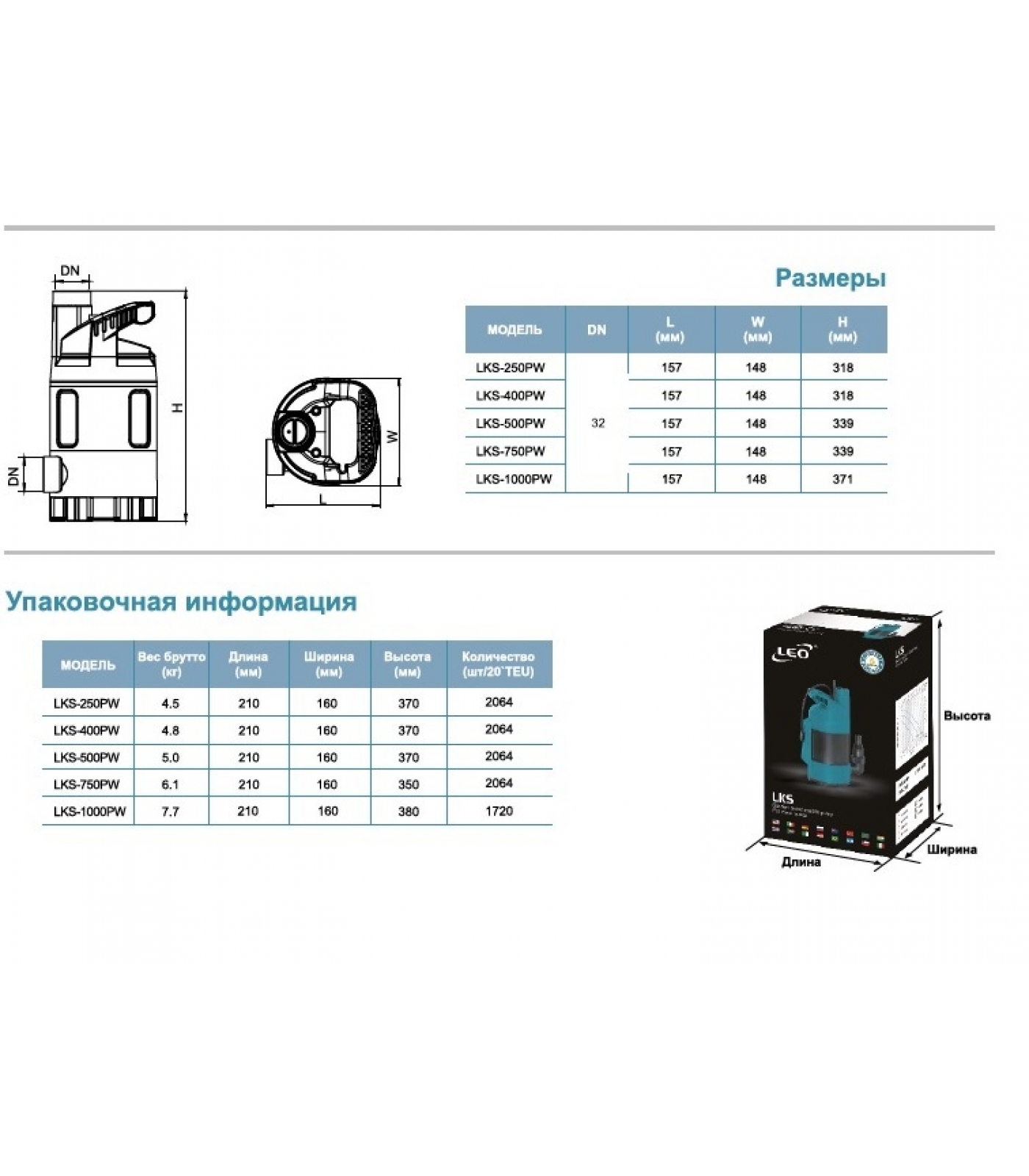 Насос дренажный (25мм.) "LEO" LKS-750 PW, (750Вт, 13.5м3/ч, H-8,7м, d 25/32/38мм, до 25мм, до 5%)