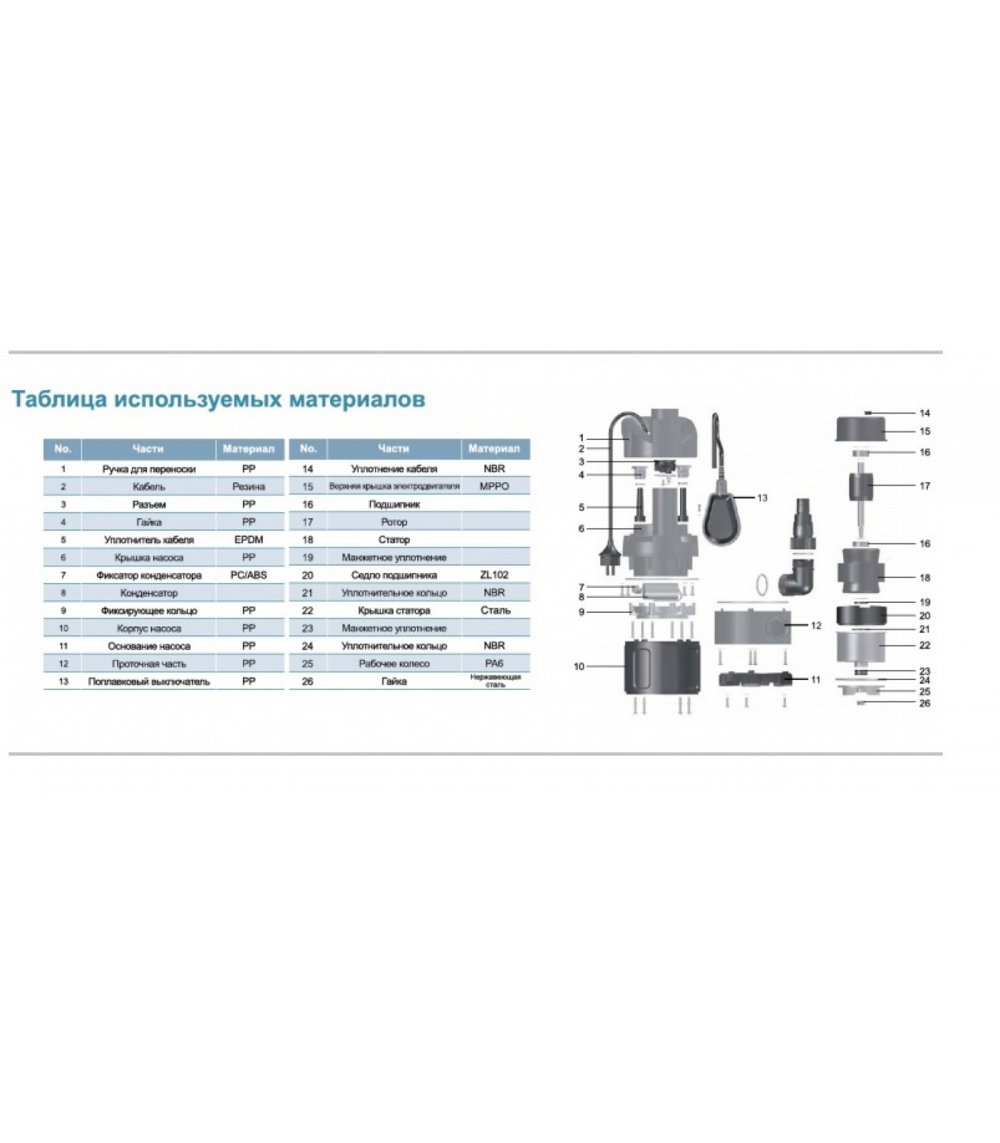 Данный погружной насос предназначен для перекачивания чистой воды, а так же воды с незначительным содержанием примесей глины и песка, общей взвешенной массой не более 5%. Данный погружной насос не предназначен для перекачивания сточных и фекальных вод.