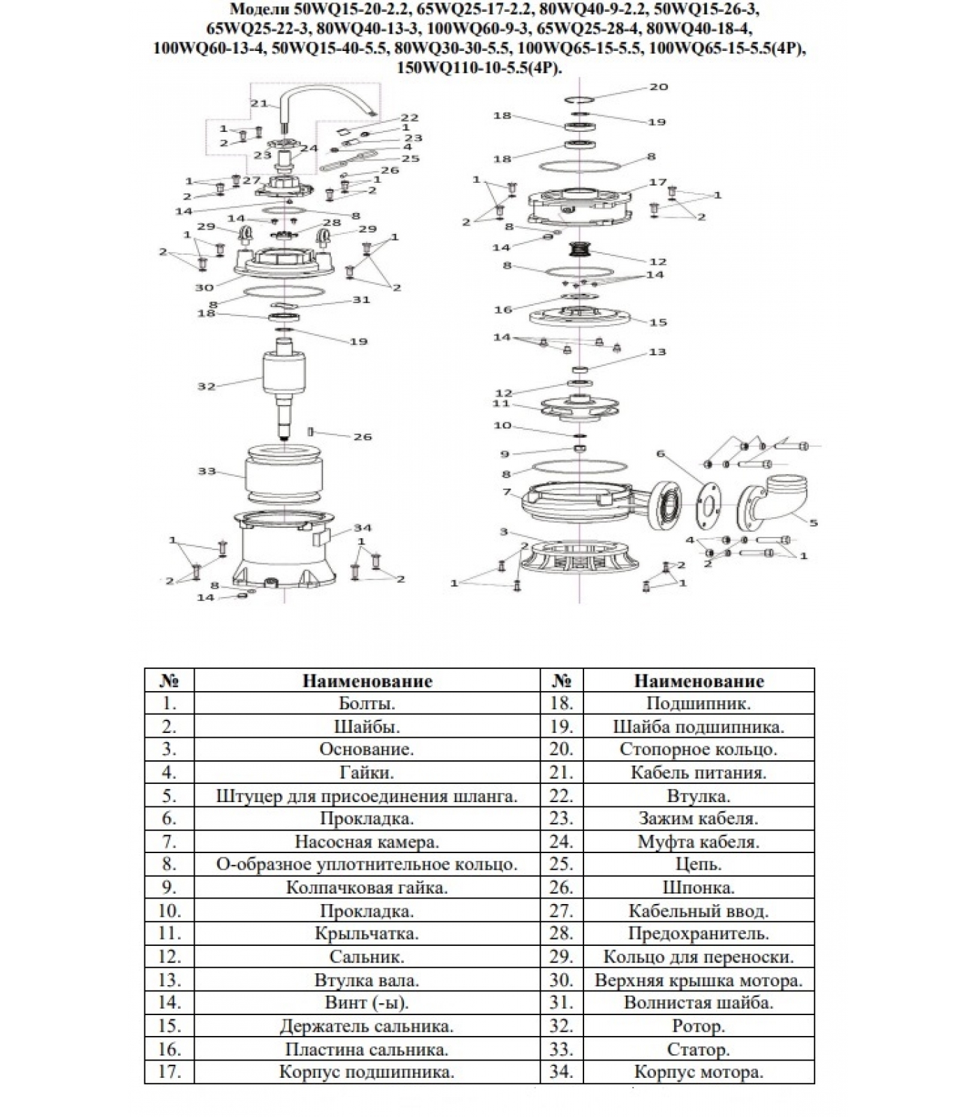 Погружные насосы фановой системы WQ предназначены для дренажа отработанной воды на заводах, строительных и хозяйственных объектах, для дренажных систем на городских станциях очистки сточных вод, дренажных насосных станций в жилых кварталах, муниципальных проектов, осушения заболоченных участков и полива полей в сельском хозяйстве.