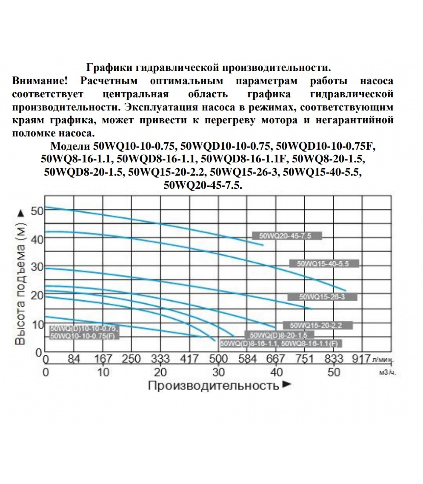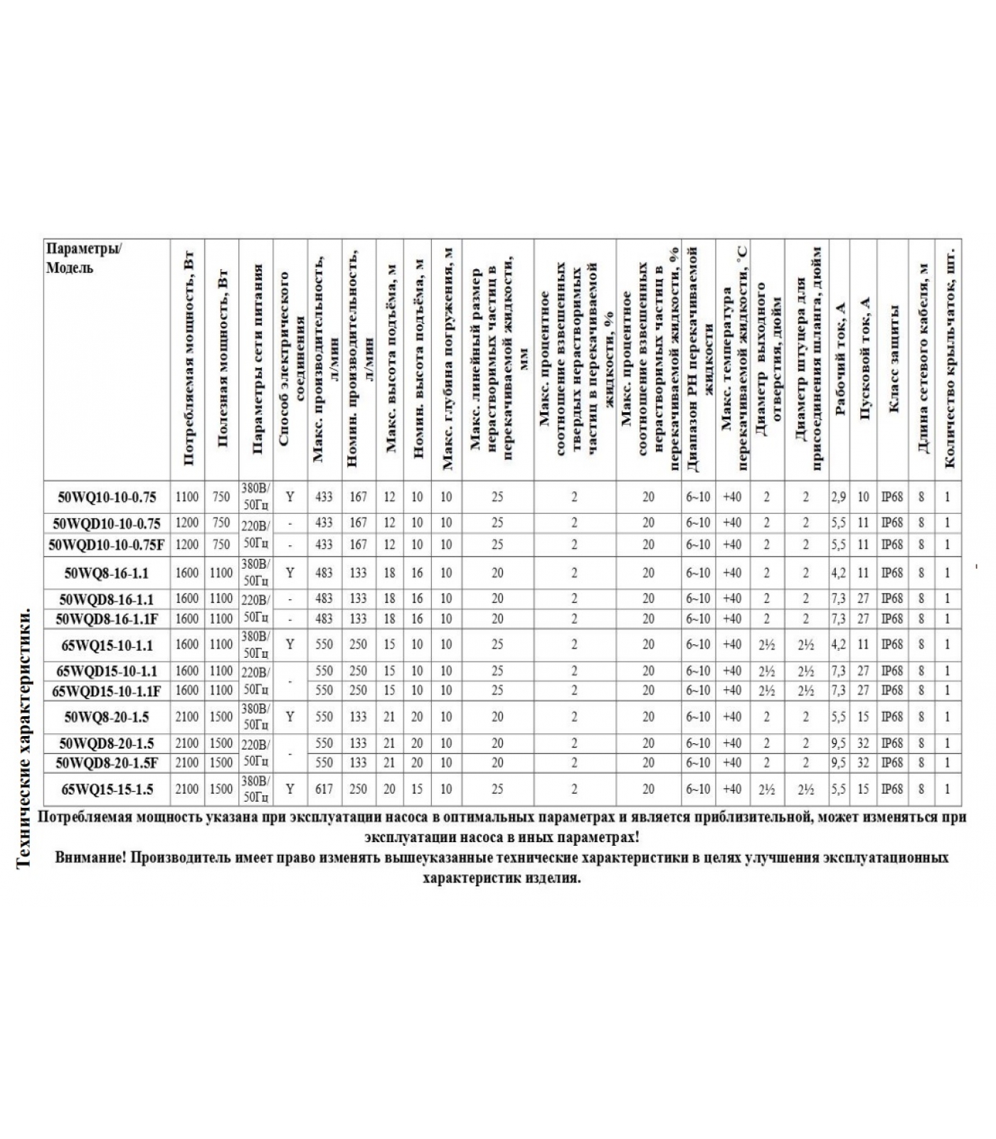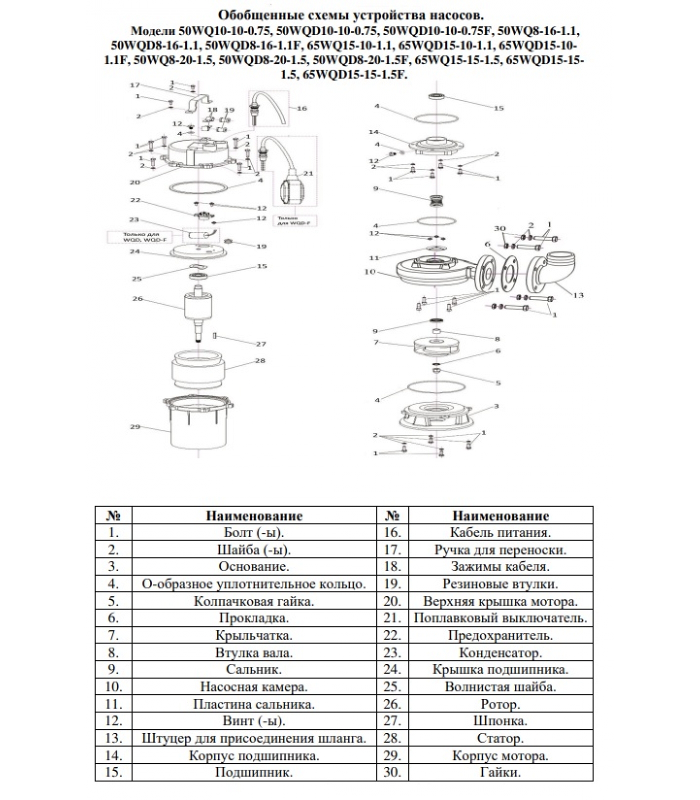 Насосы серии WQD-F снабжены поплавковым выключателем, автоматически отключающим насос при отсутствии и автоматически включающим насос при наличии жидкости для перекачивания.