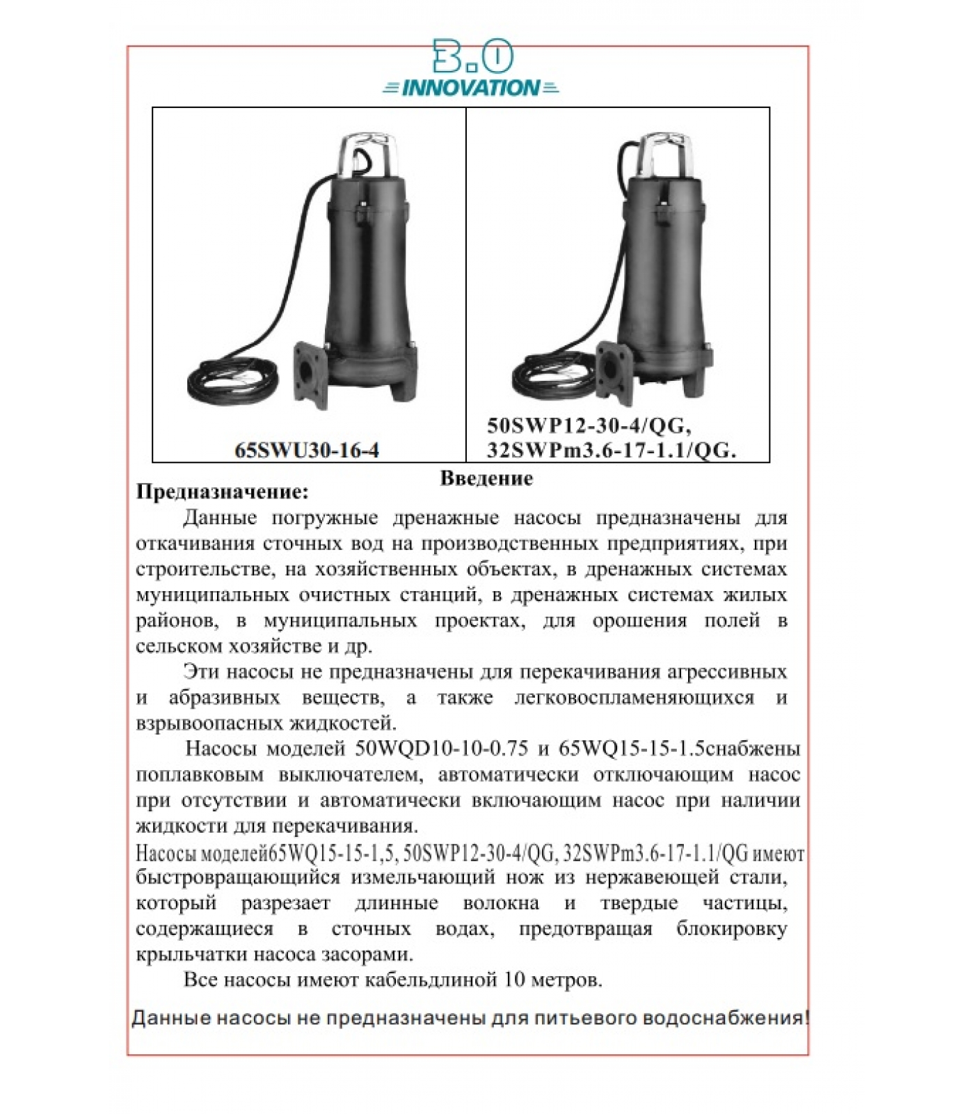 Погружные насосы для сточных вод SWU с полуоткрытым рабочим колесом применяются для откачки сточных вод из накопителей, септиков в очистных системах, с содержанием волокон в кожевенных и пищевых производствах, в управлении стоками, септиками, на животноводческих фермах, в отелях, ресторанах школах и других общественных зданиях.