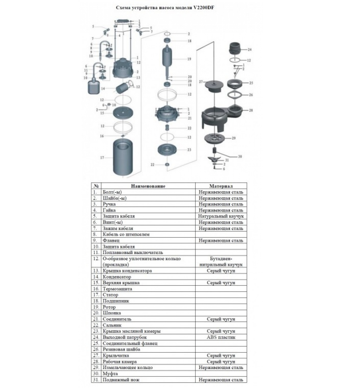 Насос V2200DF фекальный Vodotok с поплавком, нож сталь