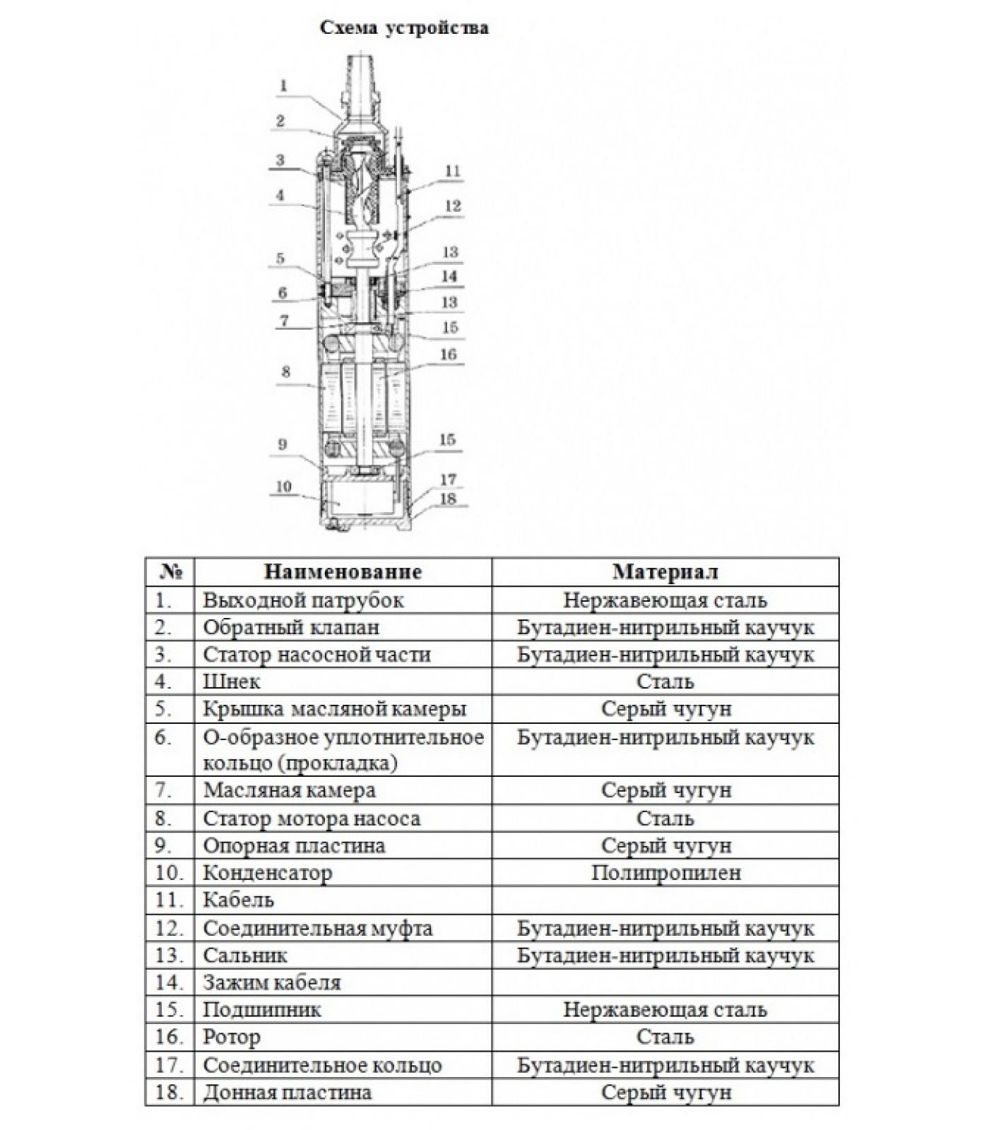 Насос имеет встроенный пусковой конденсатор. В случае перегрева или перегрузки встроенная в обмотку статора термозащита, автоматически выключает насос и автоматически включает насос после остывания мотора.