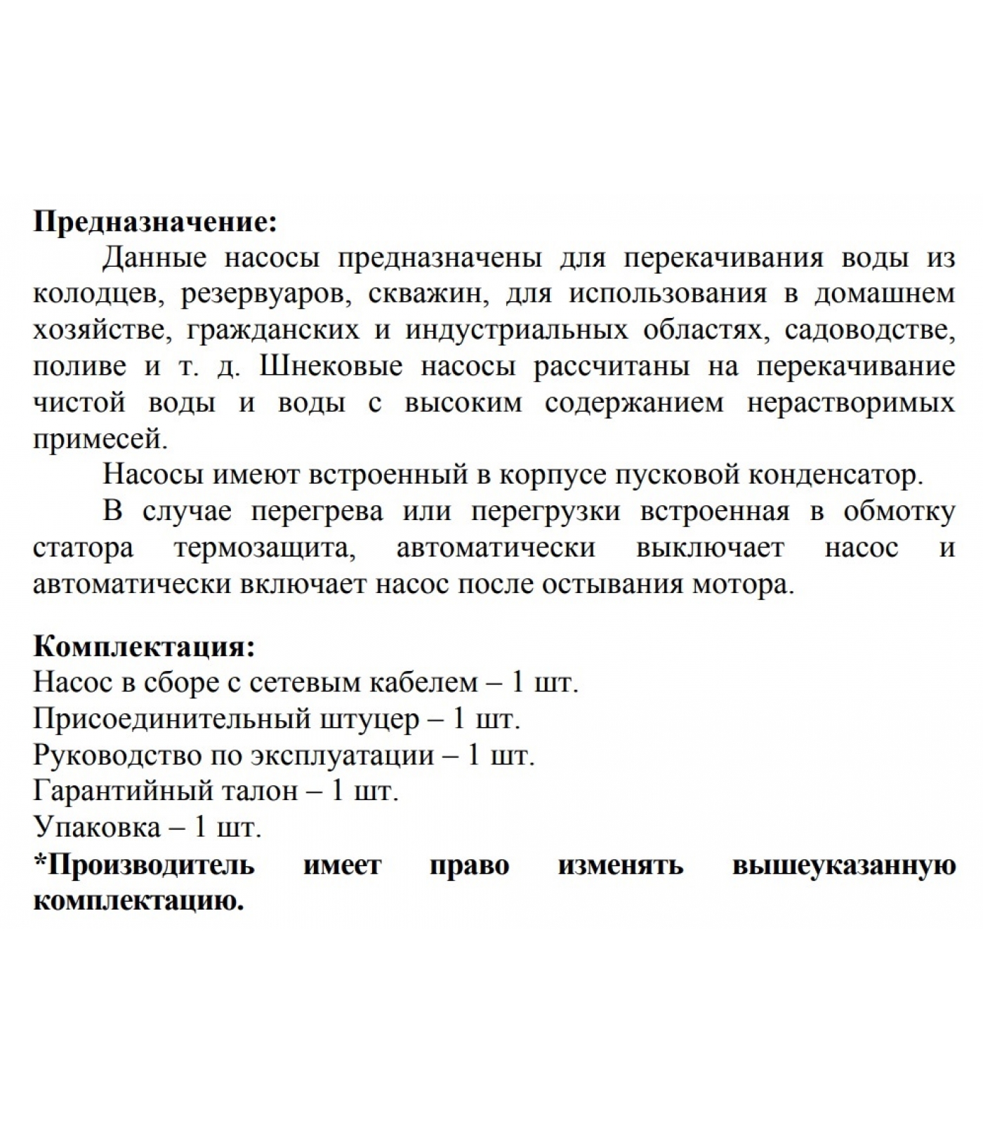 Насос имеет встроенный пусковой конденсатор. В случае перегрева или перегрузки встроенная в обмотку статора термозащита, автоматически выключает насос и автоматически включает насос после остывания мотора.