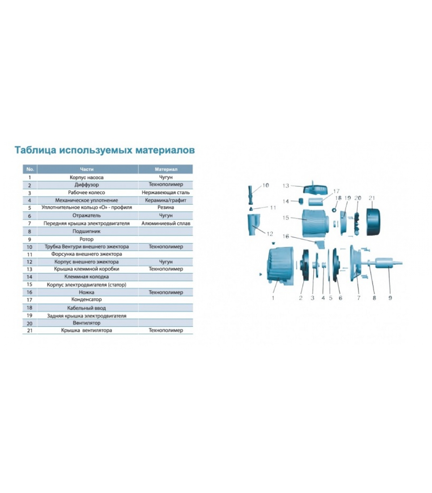 Все детали насоса, контактирующие с водой, имеют гальваническую или антикоррозийную обработку, либо изготовлены из материалов, не поддающихся коррозии. Крыльчатка и вал насоса изготовлены из нержавеющей стали АISI 304. Статор и ротор насоса изготовлены из холоднокатаной стали, что значительно улучшает их характеристики. Ротор насоса проходит процедуру сверхточной компьютерной балансировки. Медная обмотка статора насоса имеет повышенные индукционные характеристики.