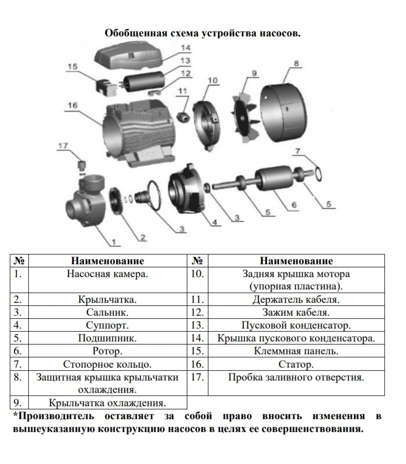 6. Встроенная в обмотку статора термозащита, предотвращающая перегрев мотора (только для однофазных насосов);