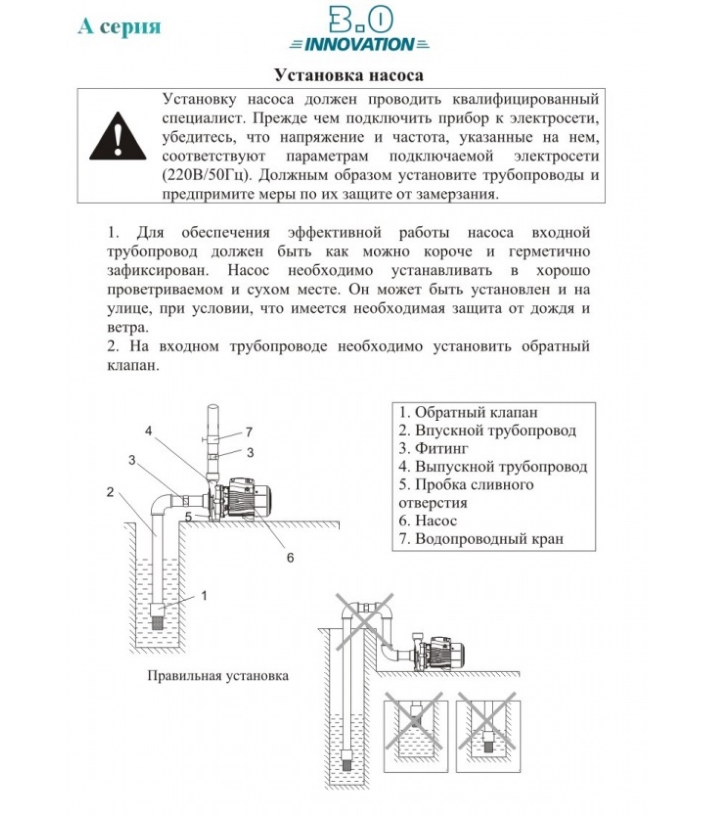 Этот насос не предназначен для питьевого водоснабжения, перекачивания агрессивных и абразивных веществ, соленой воды, а также легковоспламеняющихся и взрывоопасных жидкостей!