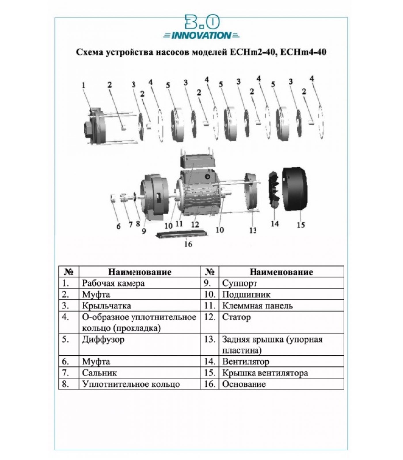 В насосах серии ECHm рабочие камеры, крыльчатки и вал изготовлены из нерж. стали марки AISI 304. Каждая крыльчатка установлена в отдельной секции рабочей камеры.