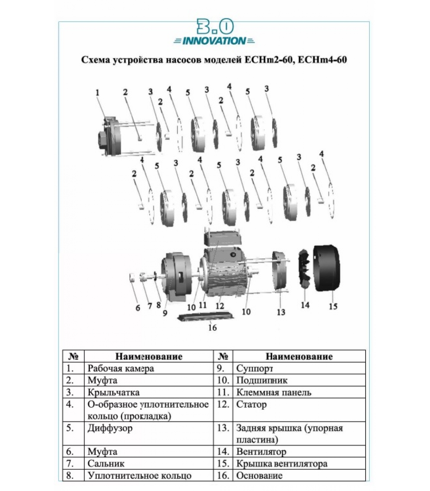 В насосах серии ECHm рабочие камеры, крыльчатки и вал изготовлены из нерж. стали марки AISI 304. Каждая крыльчатка установлена в отдельной секции рабочей камеры.