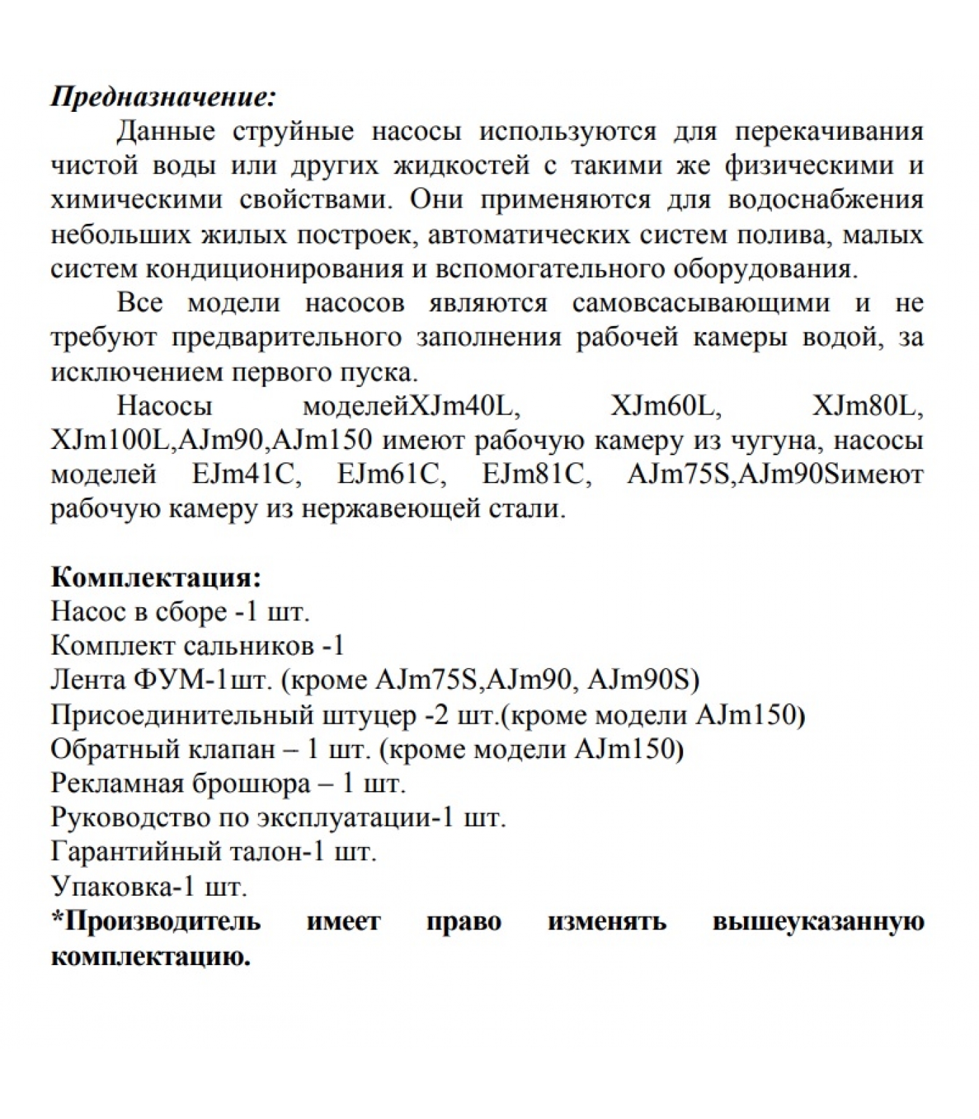 Может использоваться для перекачивания чистой воды или других жидкостей с такими же физическими и химическими свойствами.