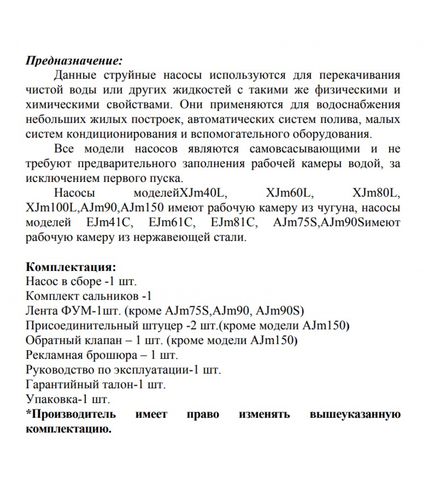 Насос является самовсасывающим и не требует предварительного заполнения рабочей камеры водой, за исключением первого пуска.