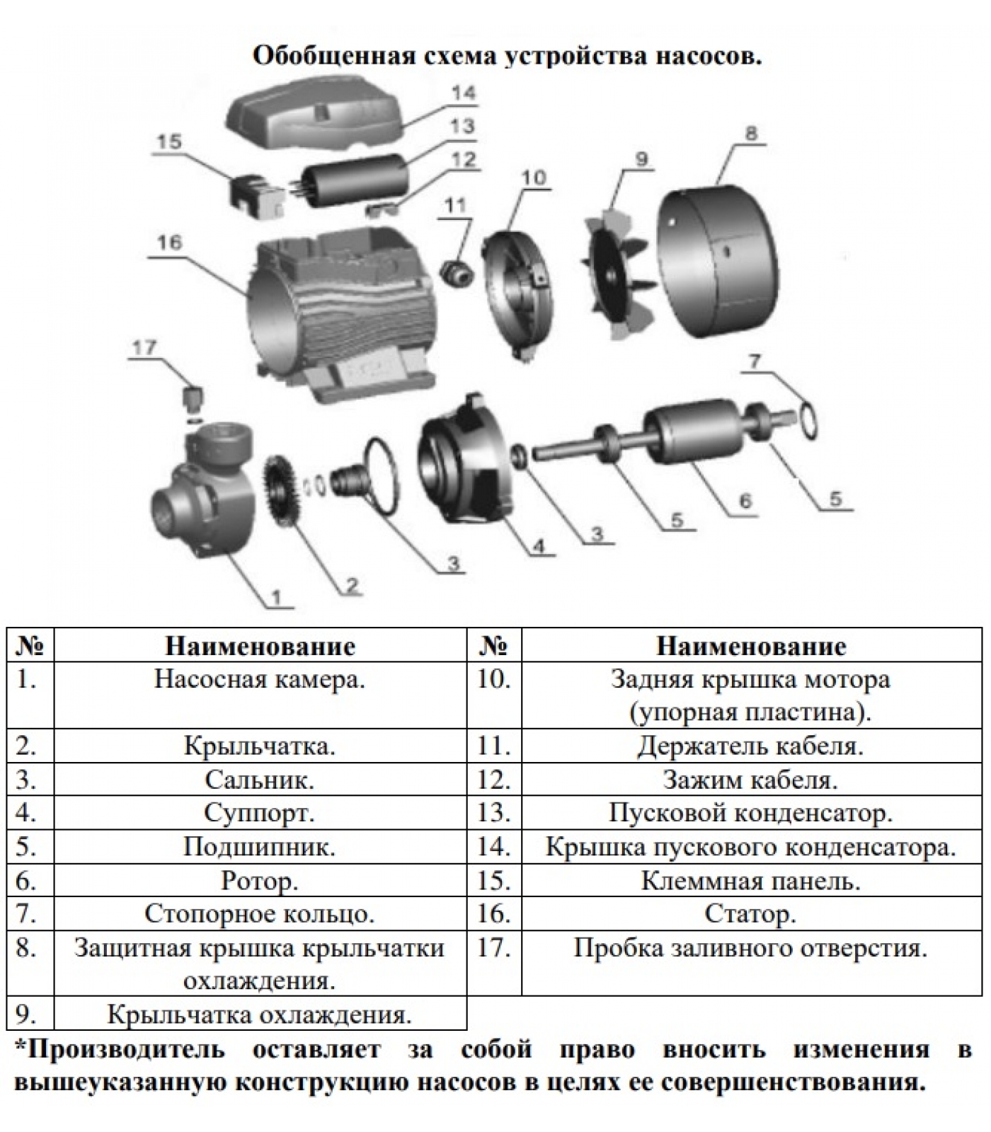 6. Встроенная в обмотку статора термозащита, предотвращающая перегрев мотора (только для однофазных насосов);