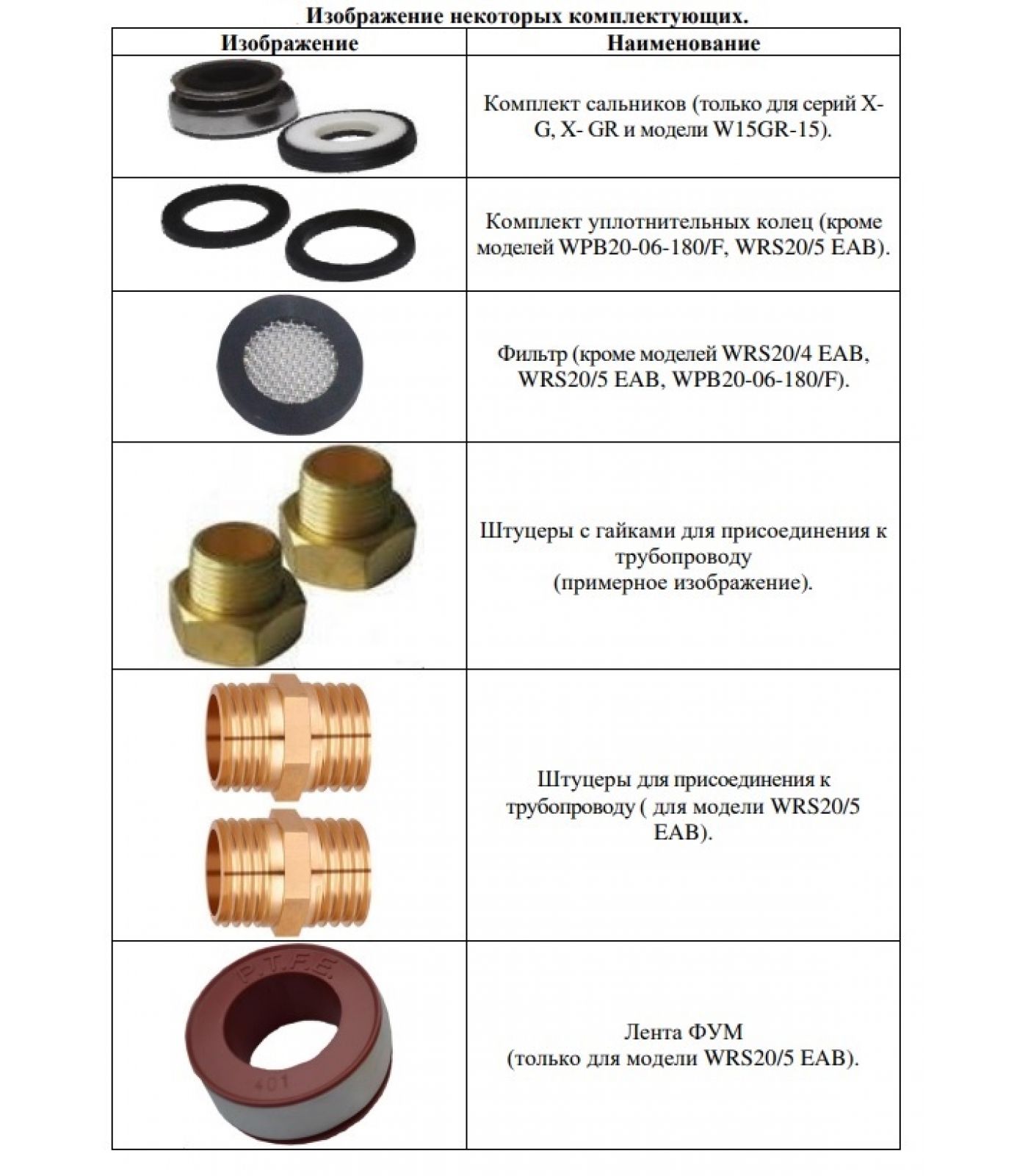 Комплект уплотнительных колец – 1 комплект (кроме моделей WPB20-06-180/F, WRS20/5 EAB);
