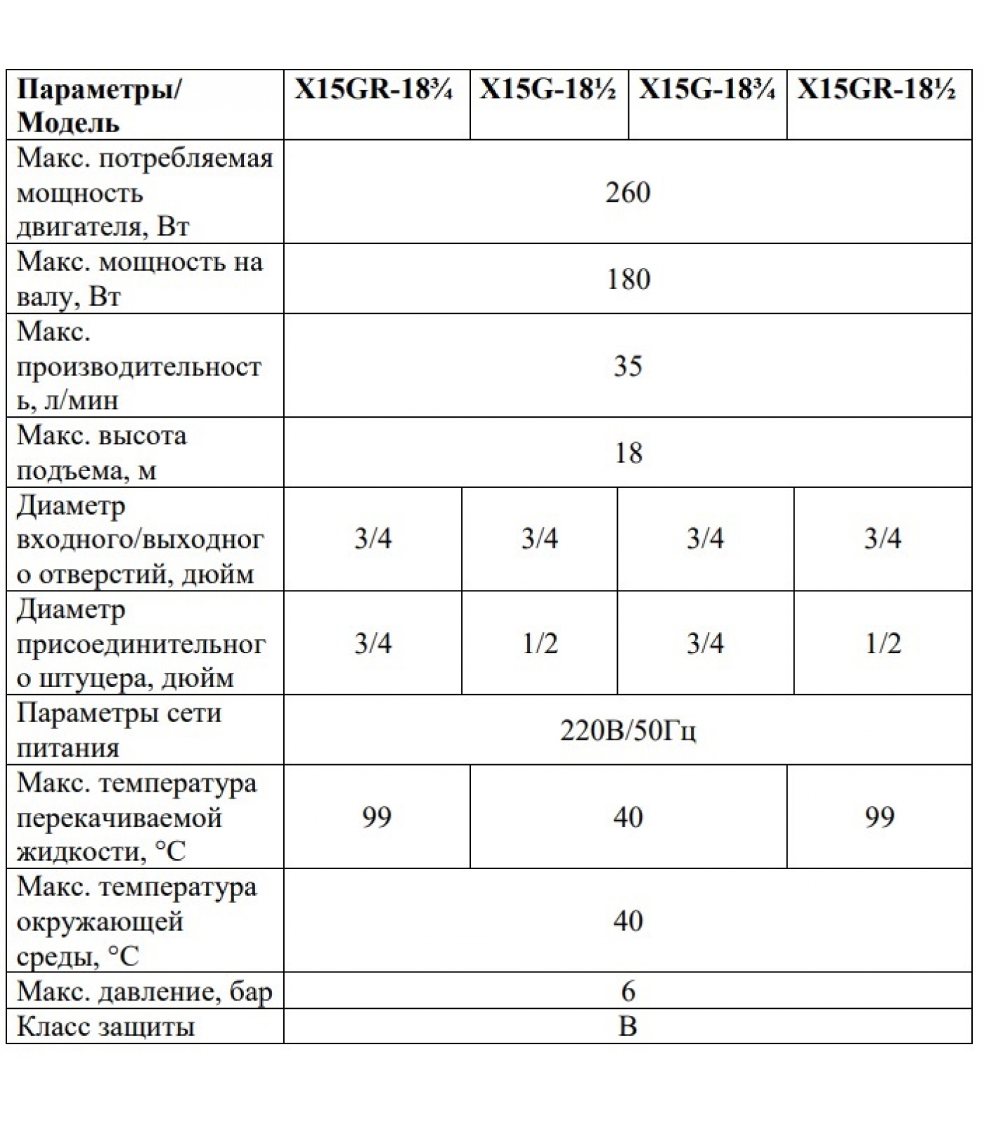 Насос повышения давления "Vodotok" X15GR-18 (1/2), (260Вт, 35л/мин, H-18м, 1.8 бар, d отв3/4", штуцер1/2", t до 100˚C)