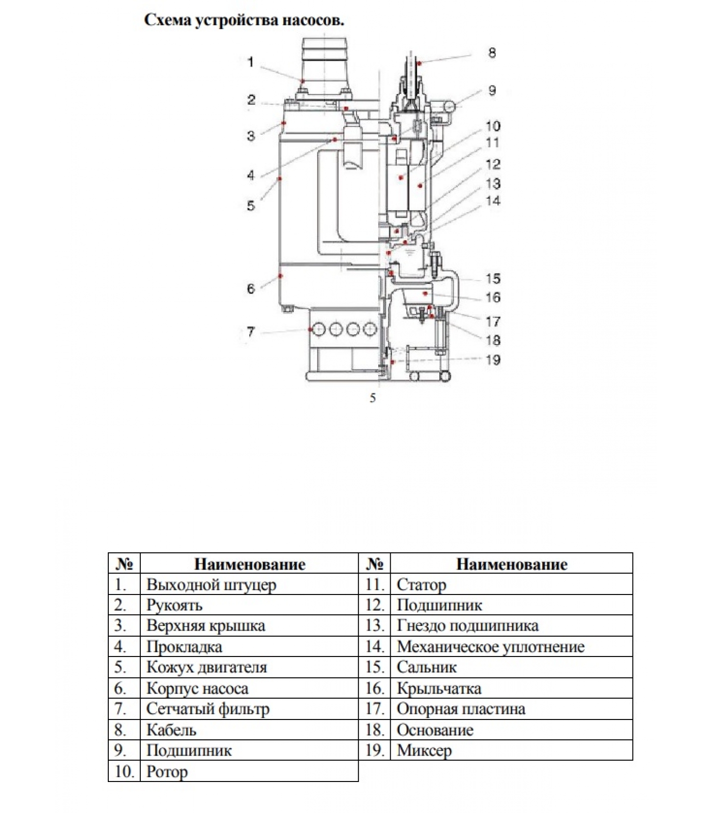 6. Устройство защитного отключения при перегреве (термозащита) установлено внутри насоса. В случае срабатывания термозащиты насос прекратит работу, пока температура мотора не придет в норму. Необходимо установить и устранить причину перегрева мотора насоса! Эксплуатировать насос можно только после устранения причины перегрева.