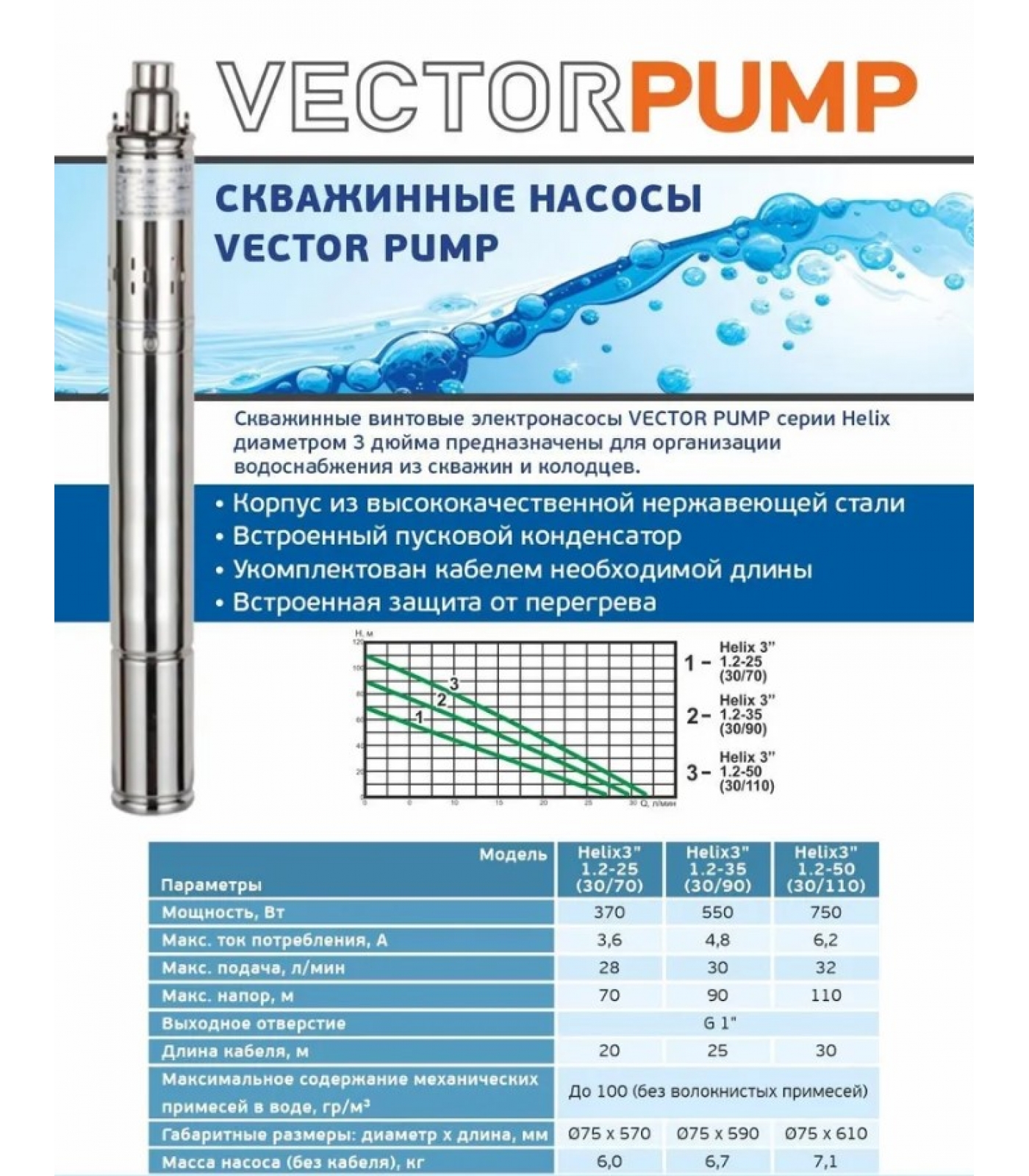 Электронасос погружной VectorPump Helix 3" 1.2-25 с кабелем 20 м для скважин 3"