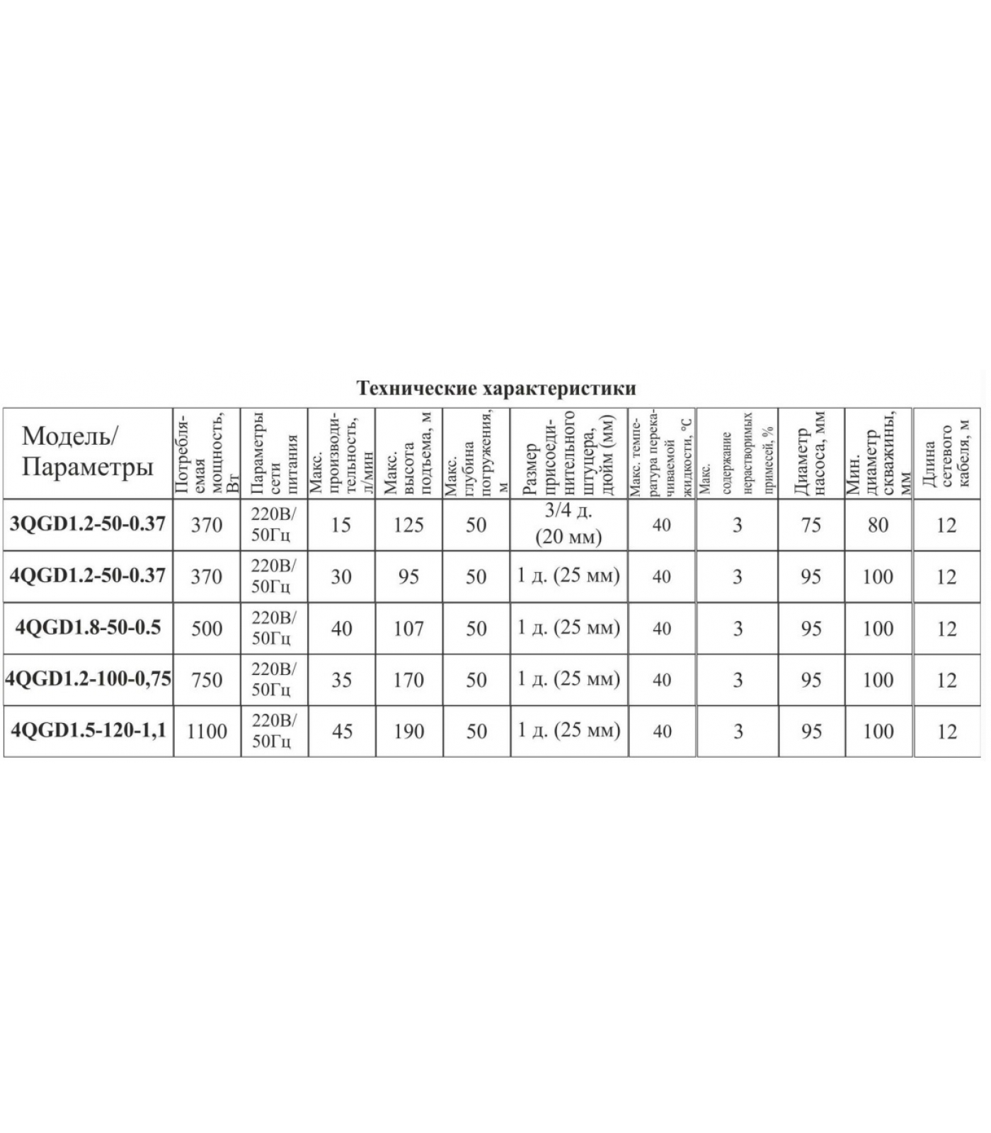 Насос погружной винтовой "Vodotok" 3QGD 1.2-50-0.37 каб.12м (d-75мм, 370Вт, 15 л/мин, H-125м, d отв.3/4", до 3%, каб.12м)