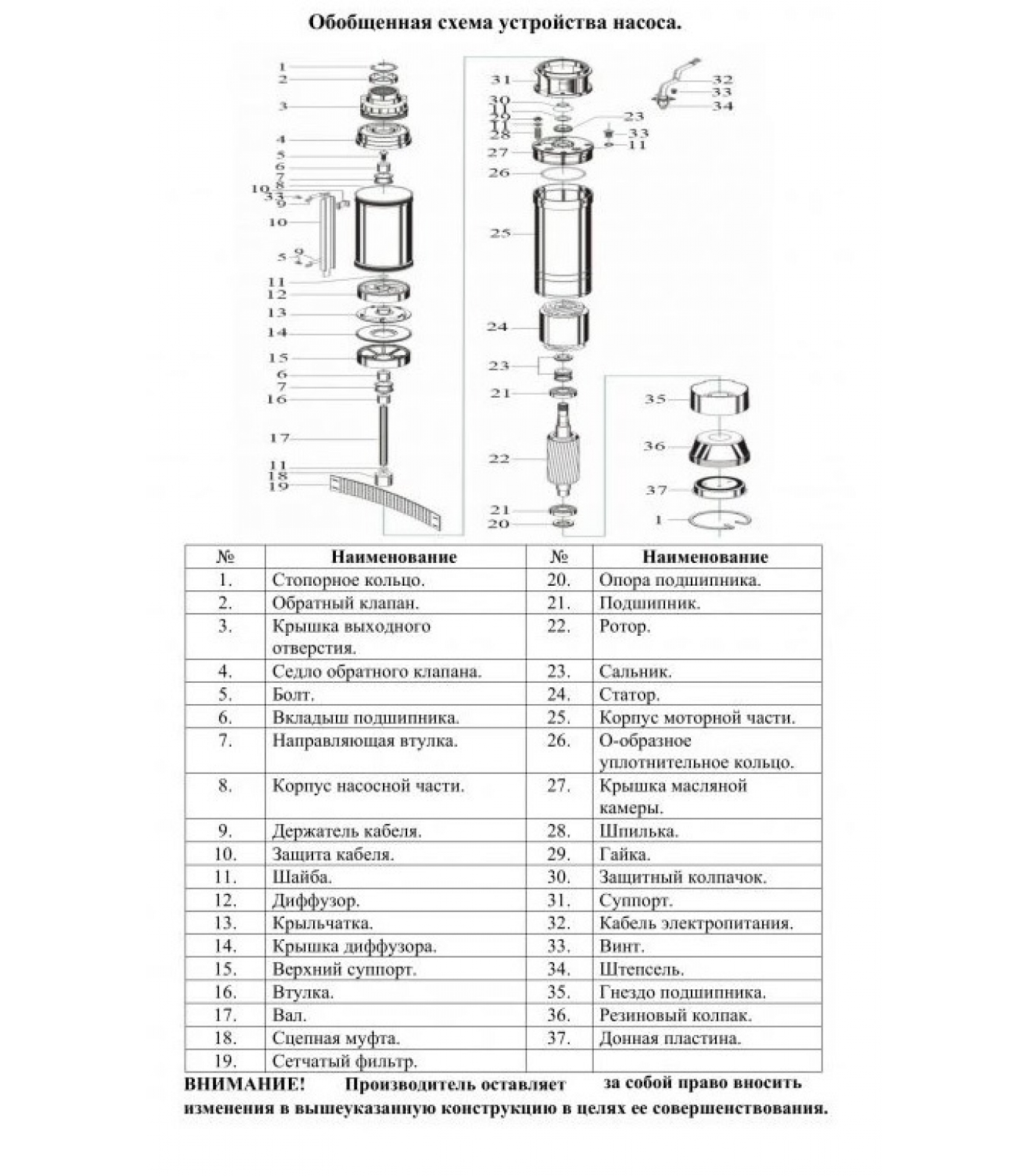 Данный насос не предназначен для питьевого водоснабжения, перекачивания агрессивных и абразивных веществ, соленой воды, а также легковоспламеняющихся и взрывоопасных жидкостей!
