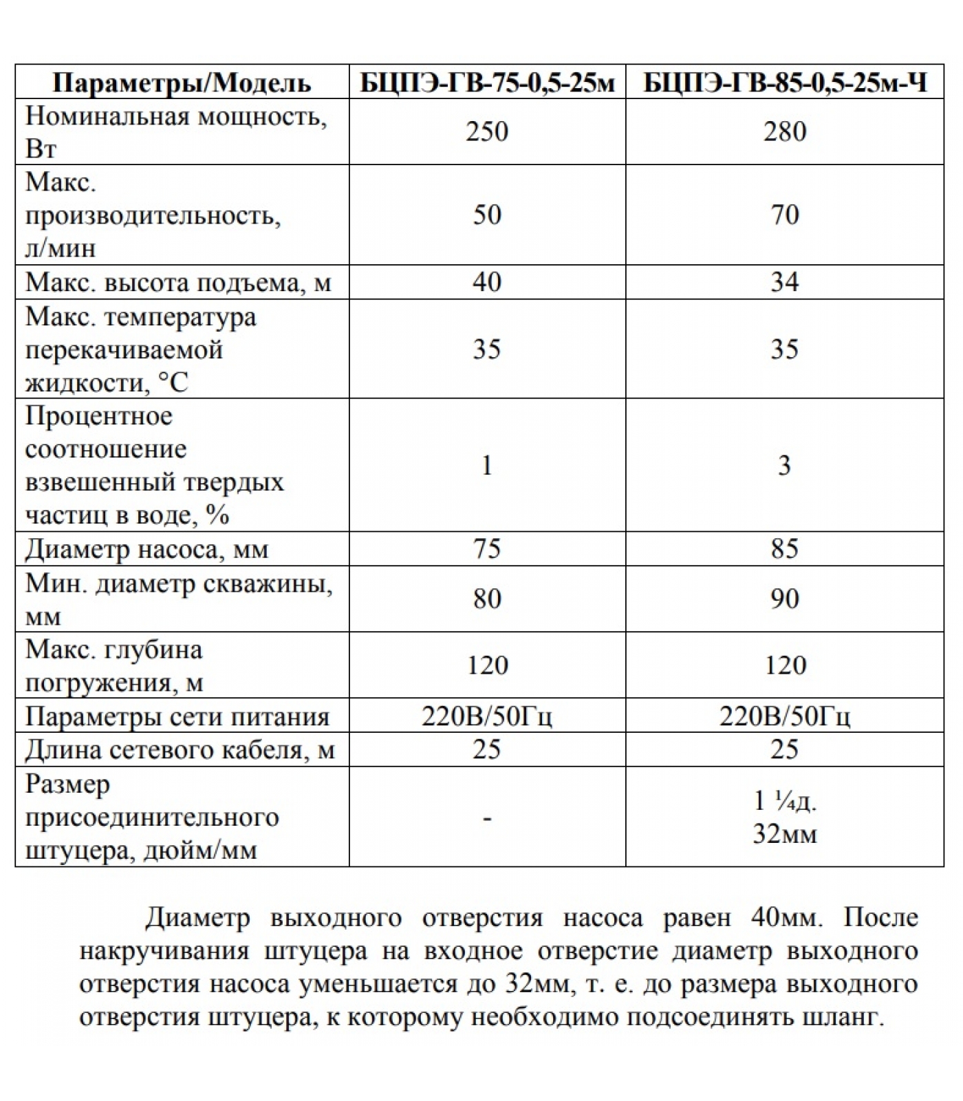 Насос погружной скважинный центробежный (для грязной воды) "Vodotok" БЦПЭ-ГВ-75-0.5-25м (d-75мм, 250Вт, max/nom-50/30 л/мин, Н max/nom-41/25м, до 1%, каб.25м)