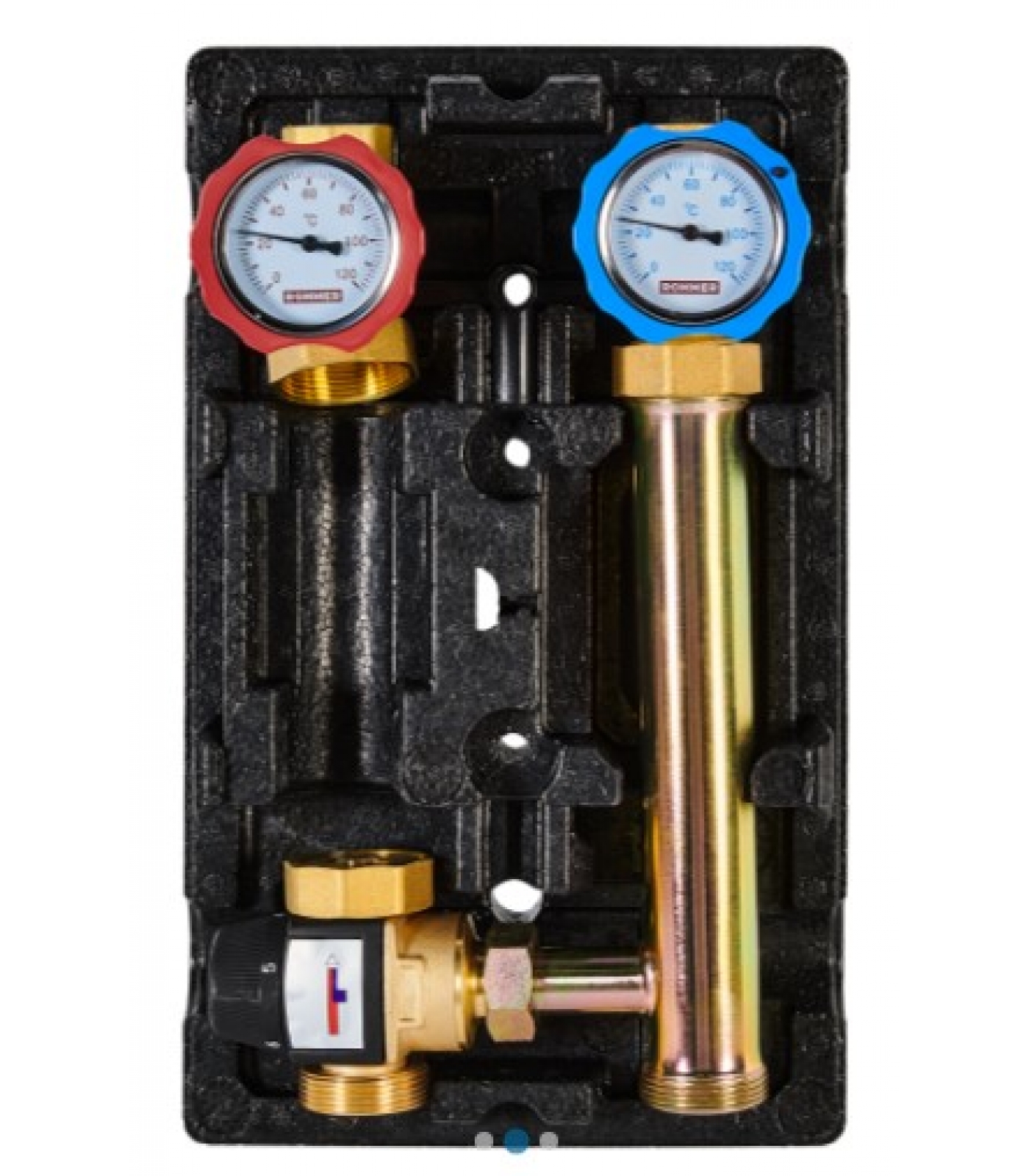 Насосные группы являются элементами гидромодуля быстрого монтажа полной заводской готовности. Предназначены для обеспечения требуемого температурного и гидравлического режимов в системах теплопотребления здания. Насосная группа быстрого монтажа с трёхходовым термостатическим клапаном предназначена для обеспечения принудительной циркуляции и поддержания постоянной температуры теплоносителя в системе отопления, например, в системе типа «теплый пол».