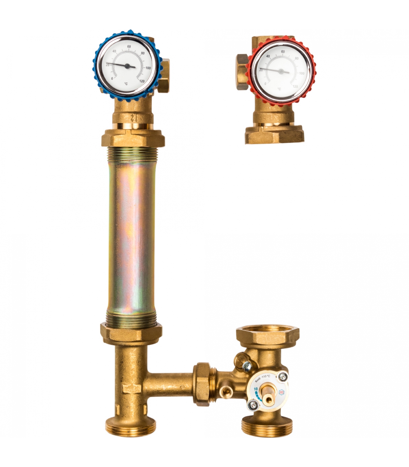 Со стороны системы теплопотребления все насосные группы снабжены запорными шаровыми кранами, совмещенными со стрелочными термометрами. На возвратной линии шаровой кран совмещен с обратным клапаном. Насосные группы DN 25 SDG-0007-002501 имеют штуцеры для установки байпасного перепускного клапана.