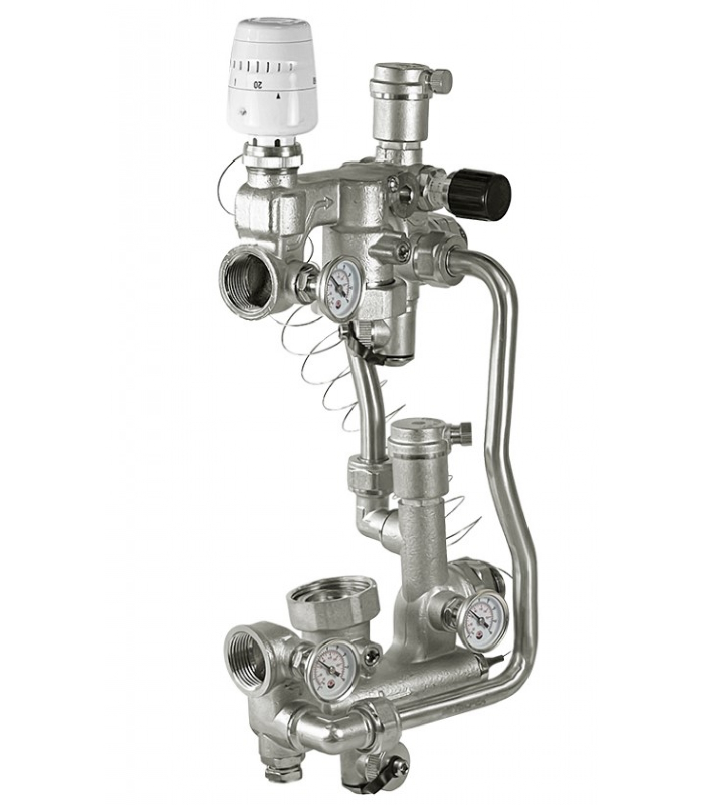 Насосно-смесительный узел с термоголовкой предназначен для создания в системе отопления вторичного циркуляционного контура с автоматической регулировкой температуры теплоносителя согласно заданного значения.