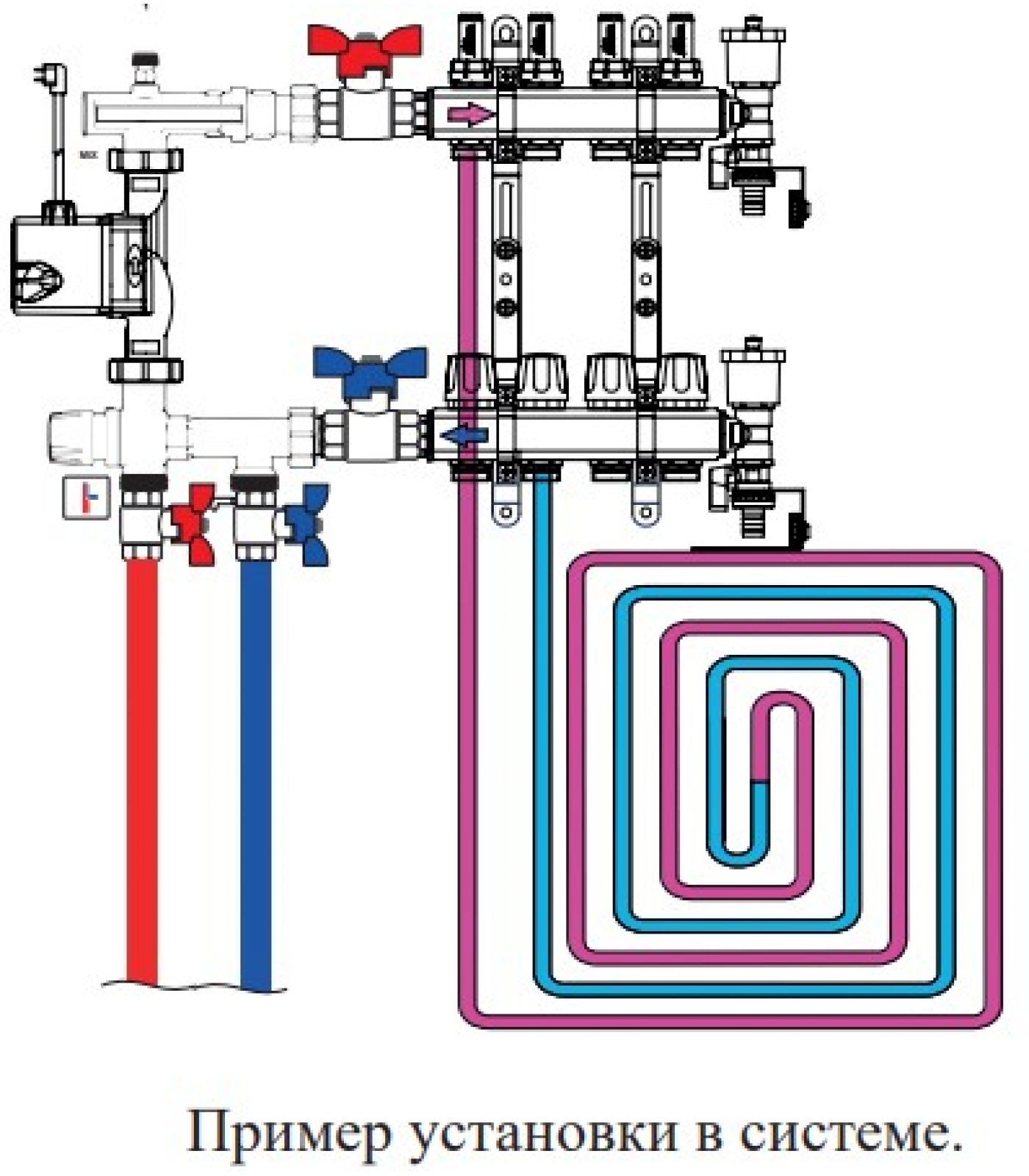 Смесительный узел на основе 3-х ходового клапана не нуждается в напоре из высокотемпературного контура, это позволяет устанавливать его на некотором удаление от тепломагистралей, после гидравлических стрелок и теплообменников.