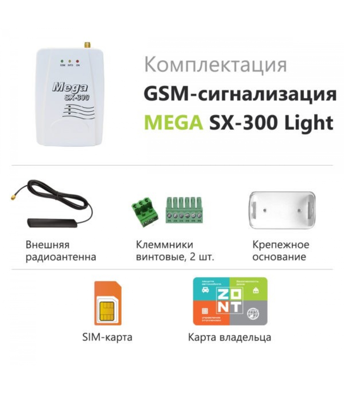 GSM-сигнализации Mega SX-300 Light – устройство для охраны стационарных объектов недвижимости с функциями контроля температуры в помещении и управлением работой электрических приборов.
