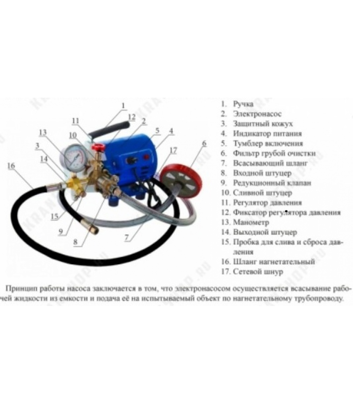 Наличие регулируемого редукционного клапана позволяет точно установить и поддерживать давление, На выходе насоса установлен гидрозаполненный манометр для контроля создаваемого давления и гибкий шланг для подсоединения к испытуемому объекту. Для точных гидравлических испытаний применяется манометр с необходимым классом точности и пределом измерения давления.